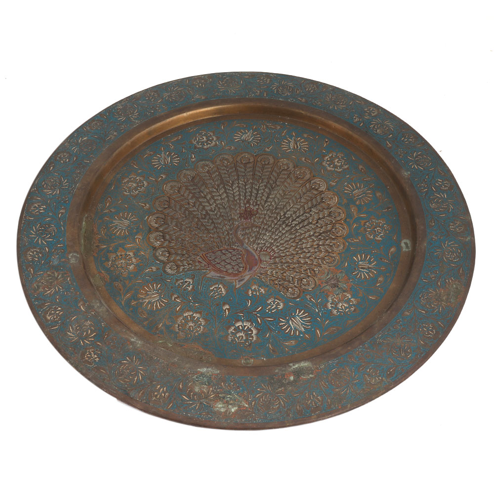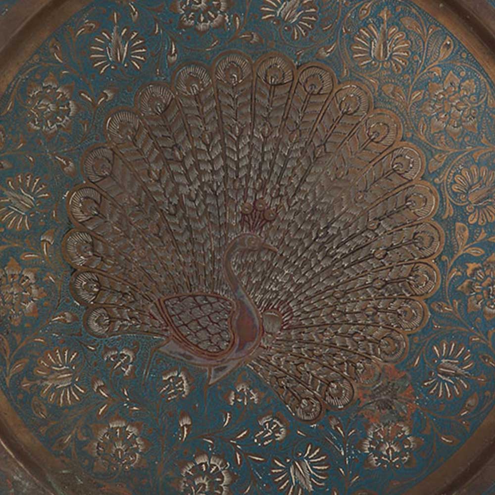 Brass Blue Painted Peacock Enameled Wall Plate is used as a Tray Table or Wall Hanging Artwork. Finely Hand-Hammered and Chiseled with Floral , Leafy Designs and Peacock bird engraved on the Blue Painted Plate.
