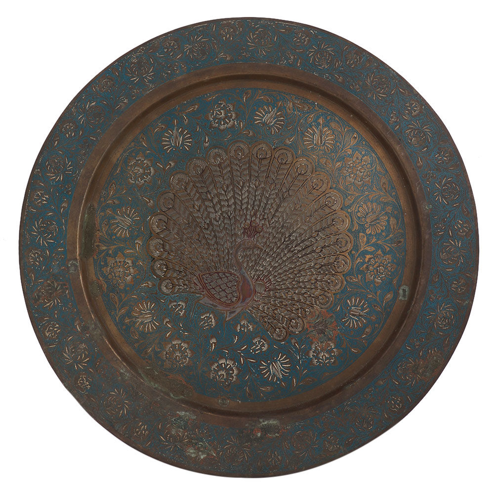 • Brass Blue Painted Peacock Enameled Wall Plate