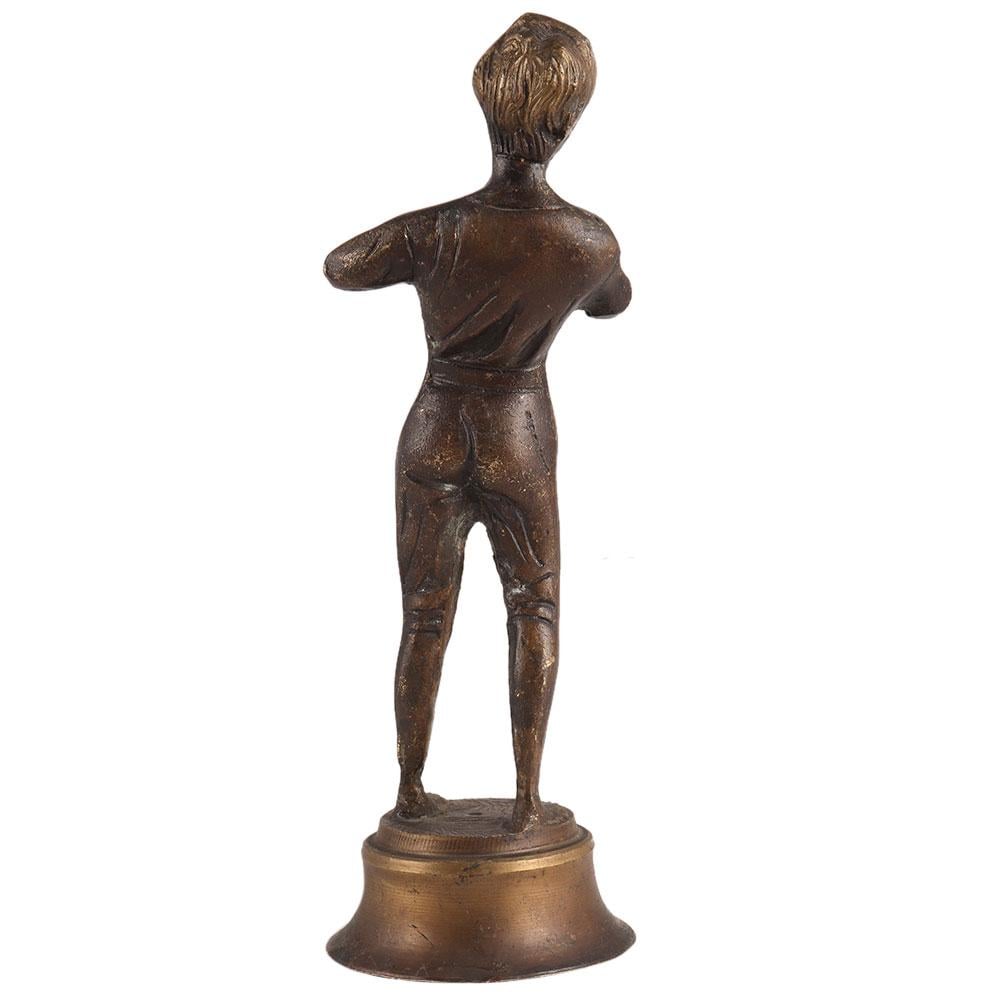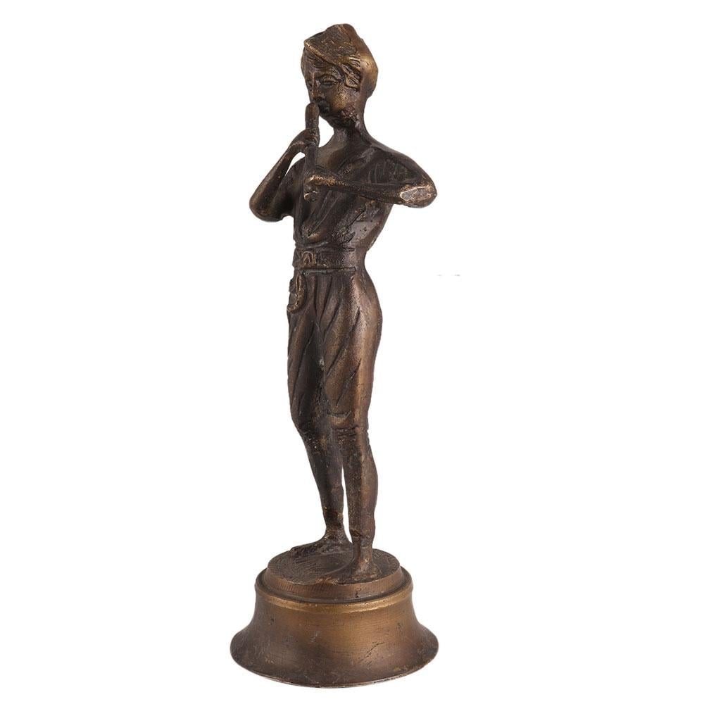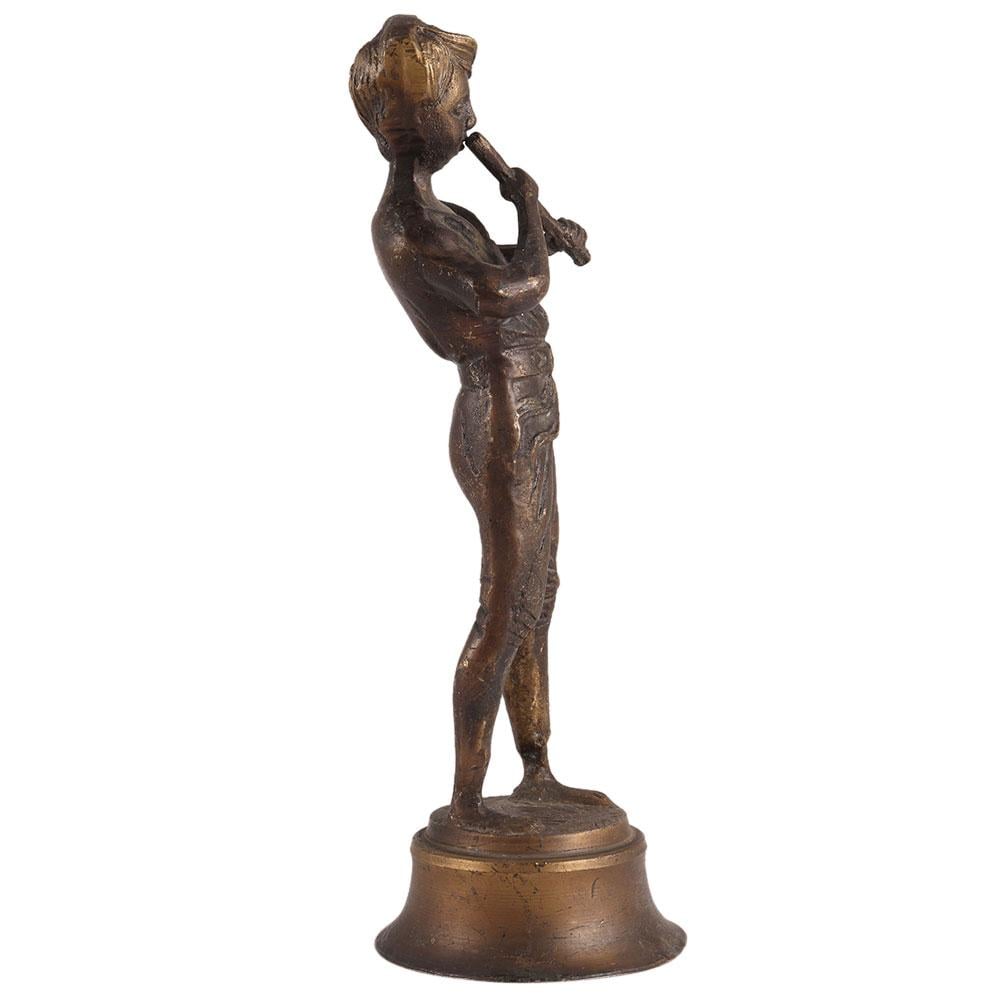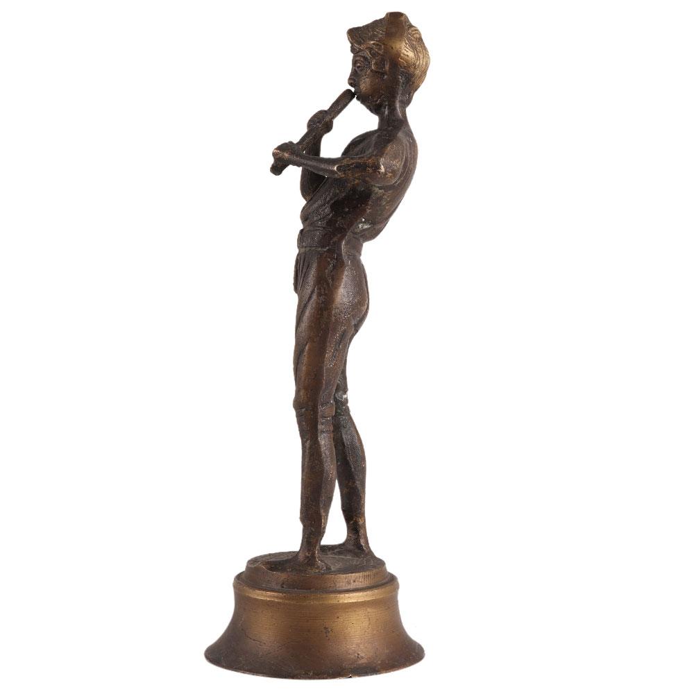 Brass statue of a boy playing the flute from the second half of the twentieth century.  This boy used to be a hunter boy from World War I.  He's not wearing any shoes, and it could be a scene of him playing the flute around displaced persons during the war.