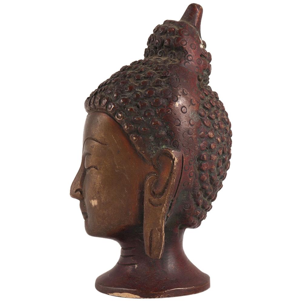 This small brass Buddha head statue has a serene expression on his face and his eyes are brooding in silent meditation. In his princely youth, his earlobes were enlarged from wearing heavy gold earrings. His hair is styled in tight, seashell curls. The statue has a lovely dark brown patina. The Buddha head is ideal for any home altar or shrine.