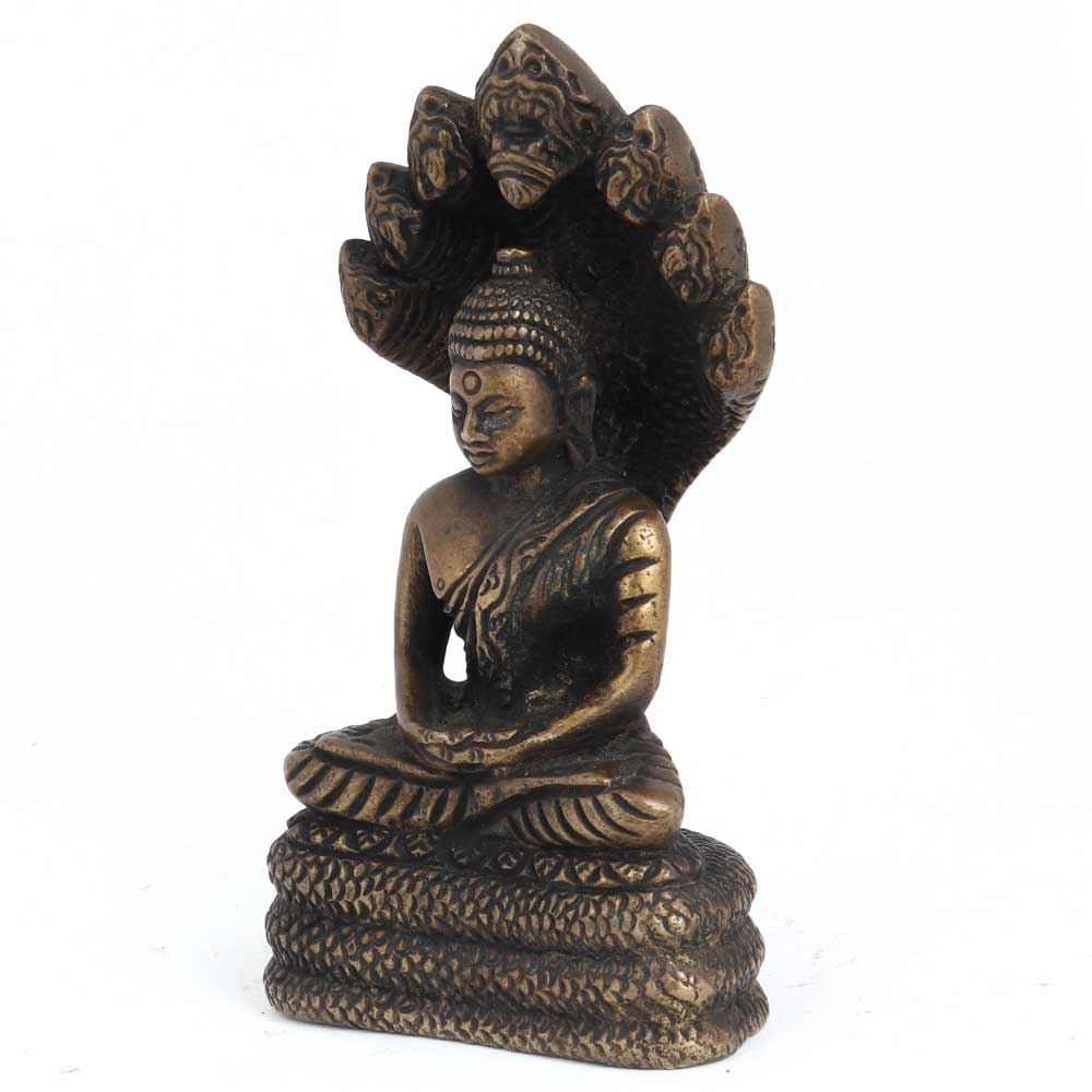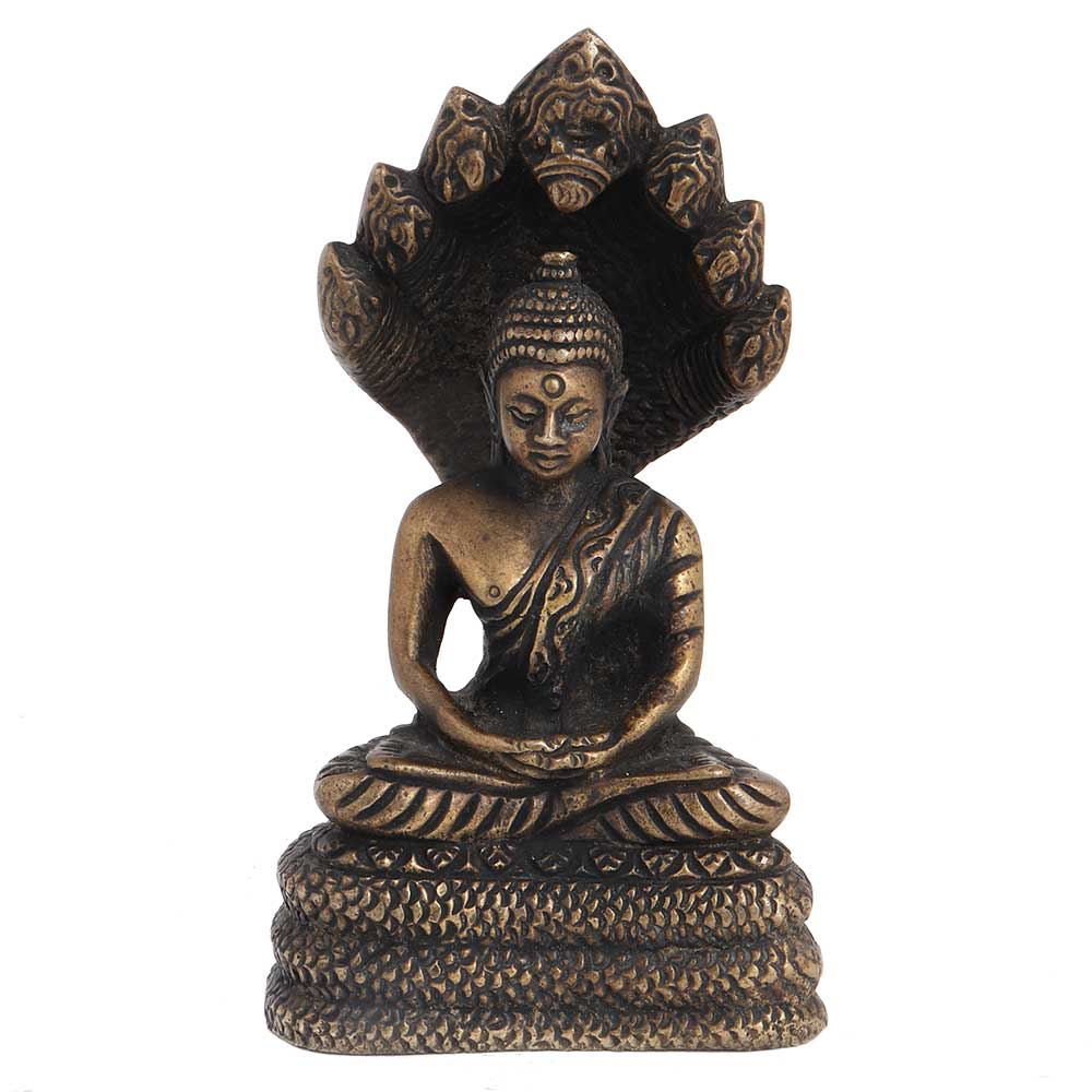 Brass Buddha Statue Sitting Under Snake Hood. This Buddha figurine is finely engraved and beautifully and is handmade. It can be used for gifting, worshipping, or for decoration.