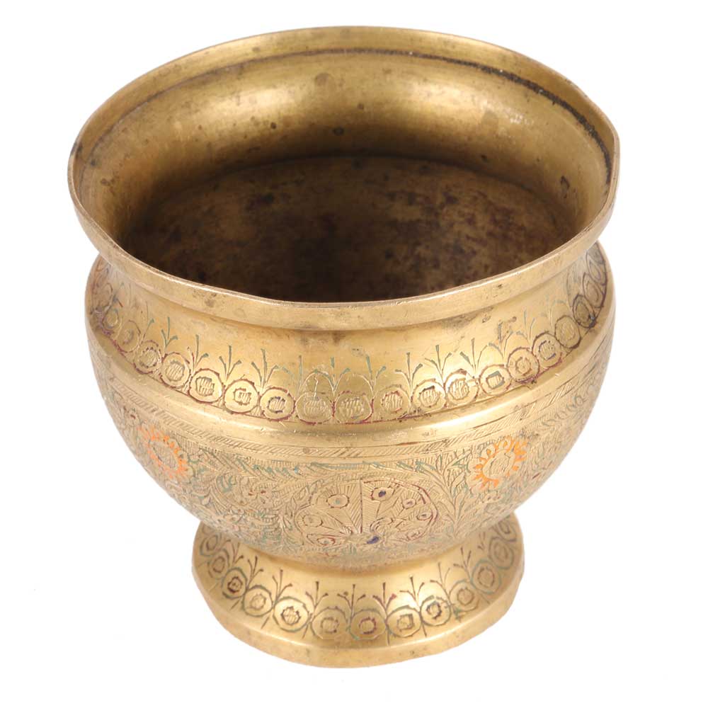 This planter is made of antique brass. This one has intricate carvings all around it. The planter is almost probably from India and is fashioned of solid brass. It's in incredible shape. There are a few traces of oxidation — in other words it has a tarnish inside as well. This medium-sized brass pot would look fantastic in a bohemian, tropical, Asian, or Middle Eastern setting. Use this as a flower planter, ring bowl, meditation pot, or treasure vase.