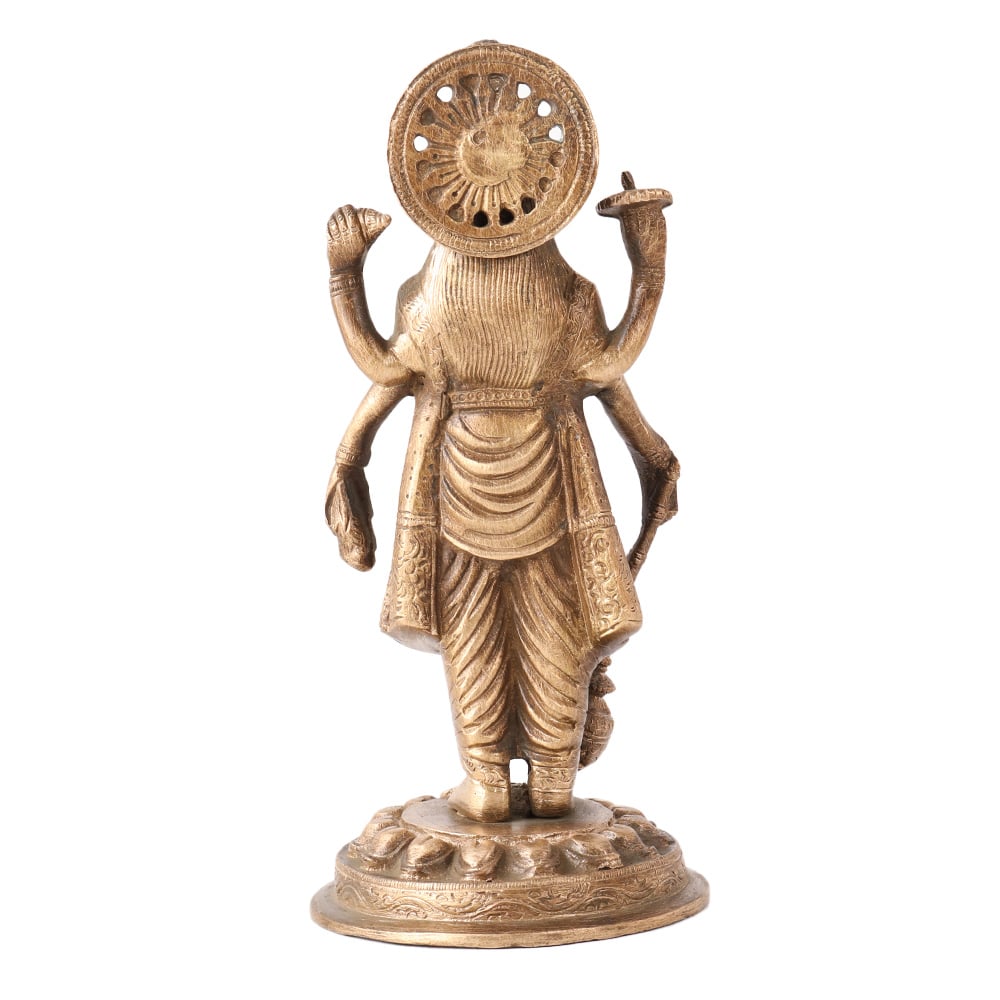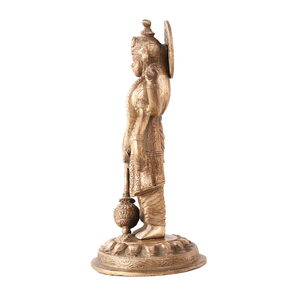 The Brass Standing Lord Vishnu Holding Club Statue is a magnificent representation of the Hindu deity, Lord Vishnu. This statue depicts Lord Vishnu holding a club in his right hand, symbolizing his power and strength. The carving sculpture is made of brass and has a golden finish that glistens in the light. Lord Vishnu is depicted with his signature features, such as his flowing hair, garland of flowers, and conch shell. The intricate details and delicate features of the statue are a testament to the skill of the craftsman who created it. The statue is believed to bring good luck and prosperity to those who worship it, making it a popular object of worship in Hindu households. The combination of brass and the golden finish gives the statue a rich and elegant look, making it a beautiful piece of art that can be displayed in any home. Overall, the Brass figurine of Standing Lord Vishnu holding club is a stunning representation of the deity and a wonderful addition to any collection of religious art.