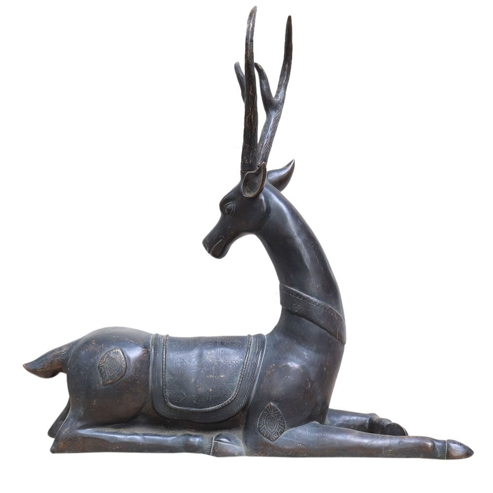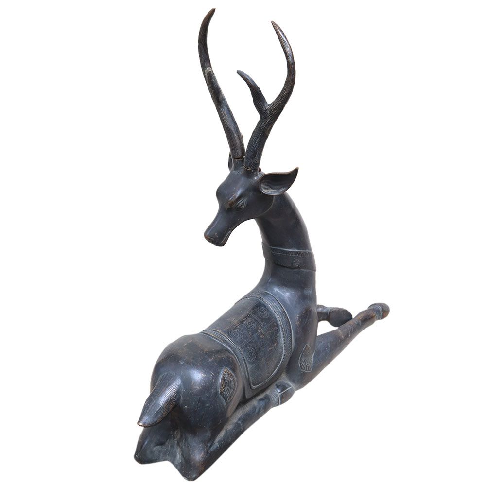 Excellent vintage large brass deer figurine. This deer is lying down, one leg out and the other bent in. Carved ornamentation on the head and around the neck. The deer has patina and oxidation on it, which adds to its allure.