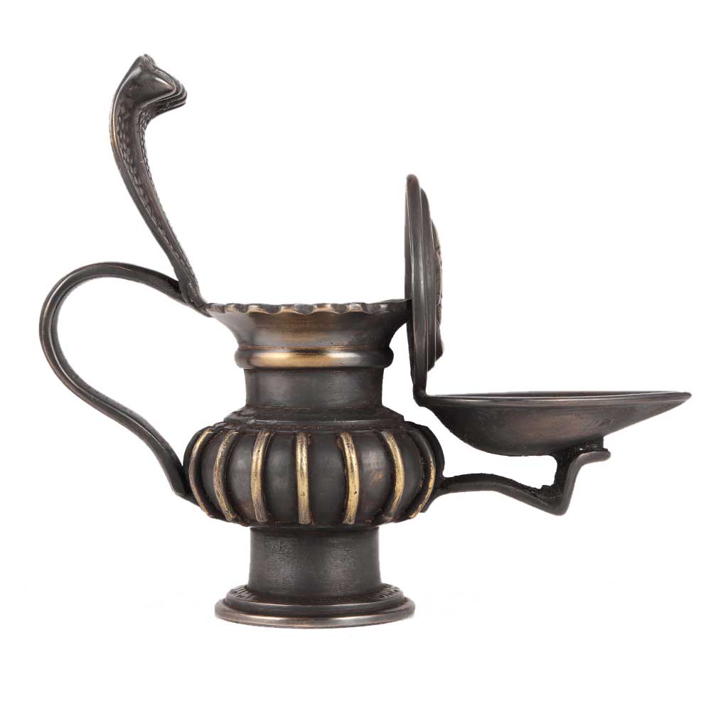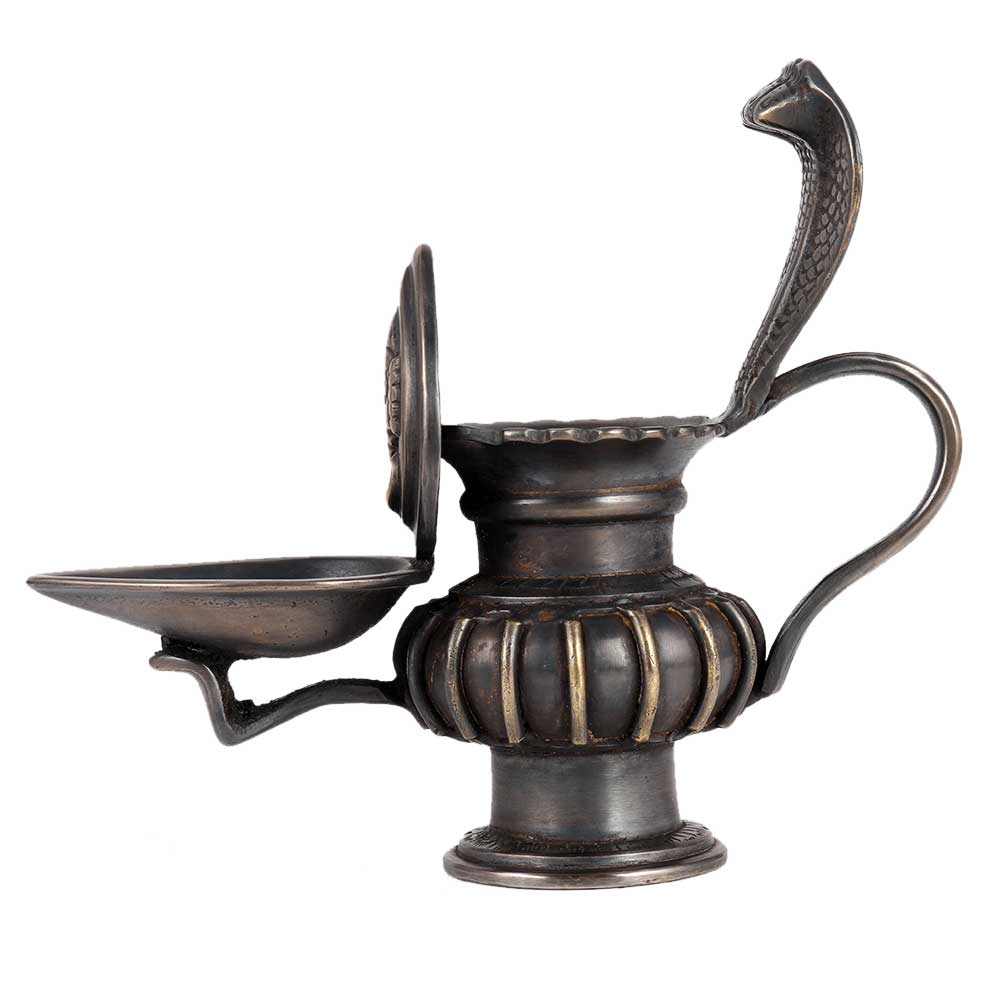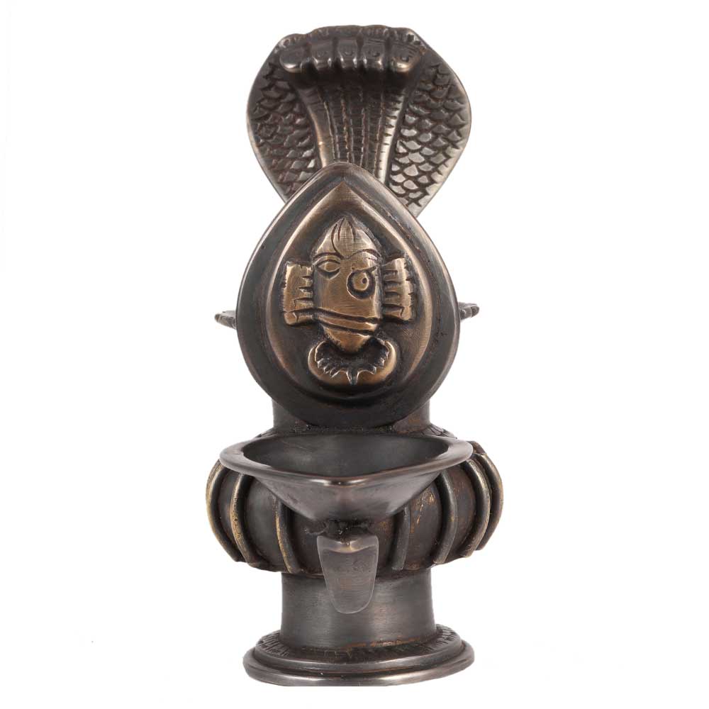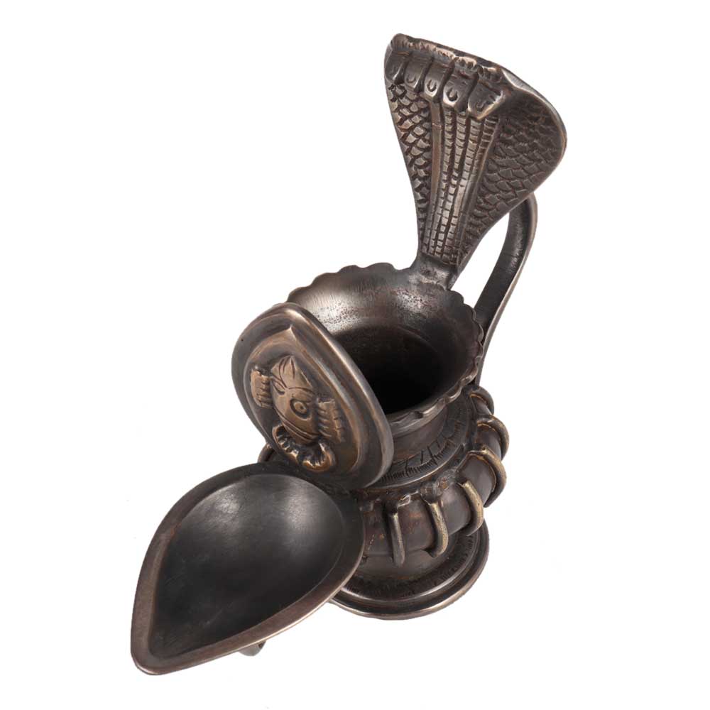 This lovely Brass Naga Aarti Diya or Naga Panch Aarti Vilakku, suggestive of a bygone era, is sure to give vintage appeal to your household. It has the shape of a small pot with a cobra head and a small diya with a god motif.