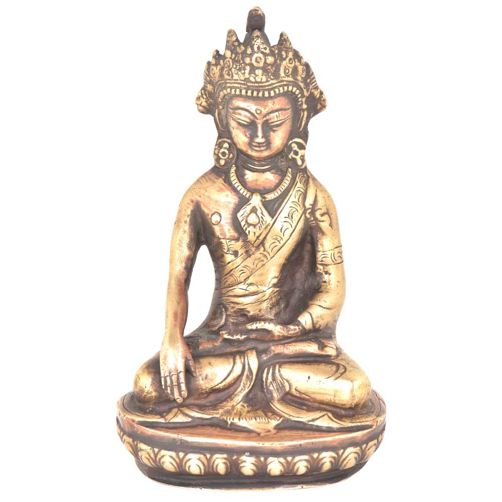 Shakyamuni Buddha is represented here at the moment of enlightenment, the earth as witness. The mudras, or hand gestures, also symbolize the union of skillful means (right hand touching the earth), and wisdom (left hand in meditation posture). His robe is ornamented with seated buddhas, his head is surrounded by lotus flowers, symbol of purity and compassion.