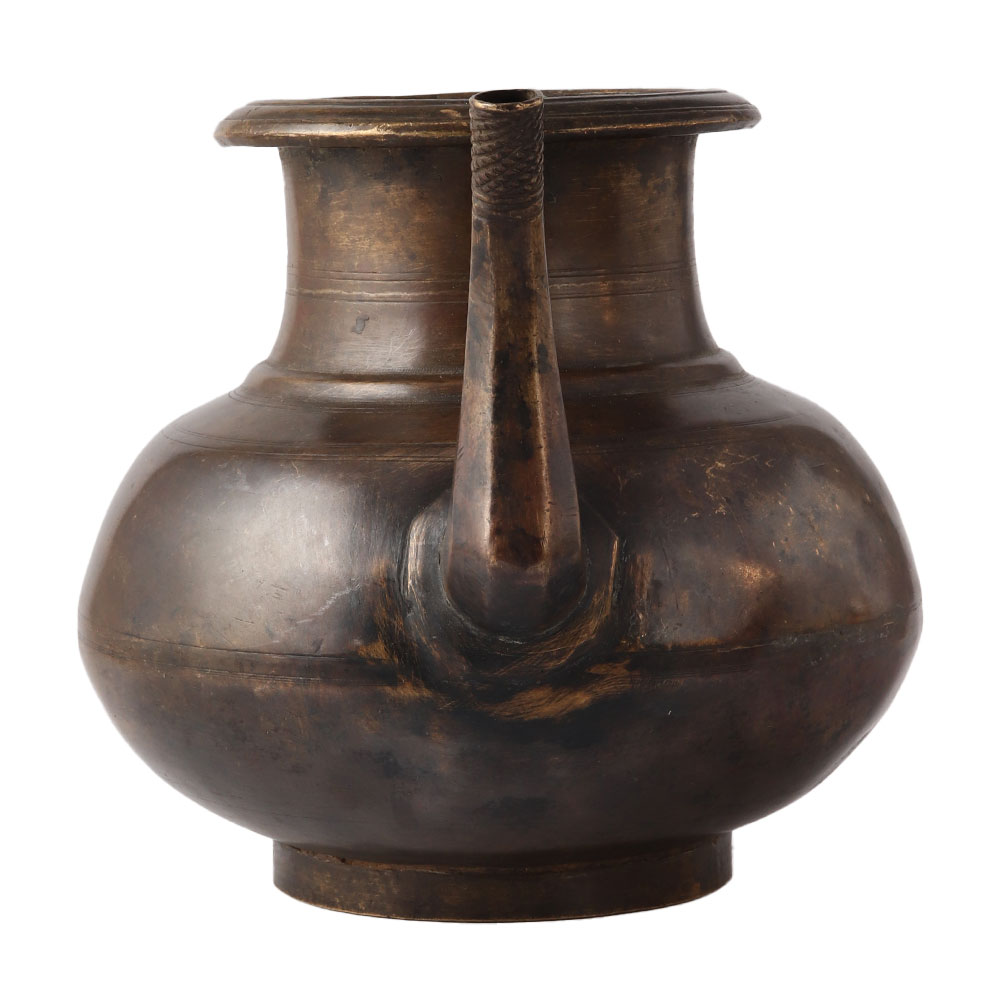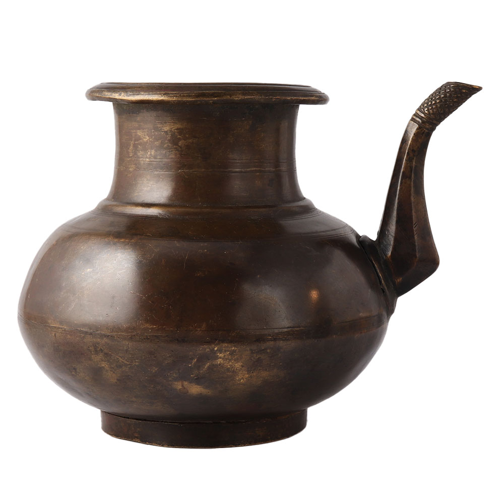 This classic brass water pot is used in temples, churches, and other religious buildings as well as the karva pots. The pot features a small mouth, a slender neck, and a spherical base. It includes a spout that allows you to pour the liquid from the pot. Use it as a gift for loved ones, a wedding decoration, or a house accessory.