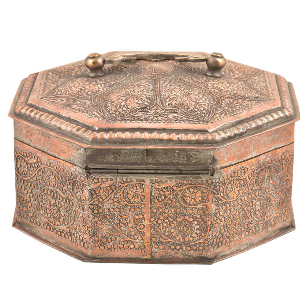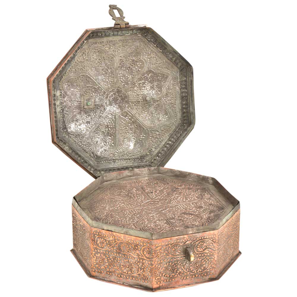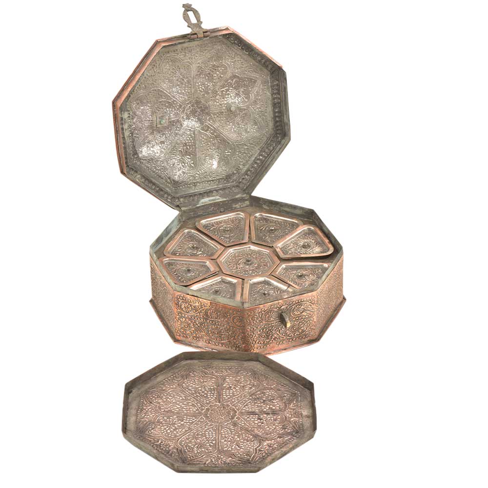 Hand Embossed Copper Betel Nut Pandan Box – with hand hammered floral and incised decoration used to store betel leaf, lime, tobacco and the nut from the areca palm. The practice of chewing betel nut was popular all over Asia and is still a common practice in Myanmar and India. This Pandan betel nut box contains six small pots, each incised on the tops and sides with the same design and metal.