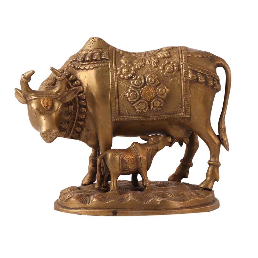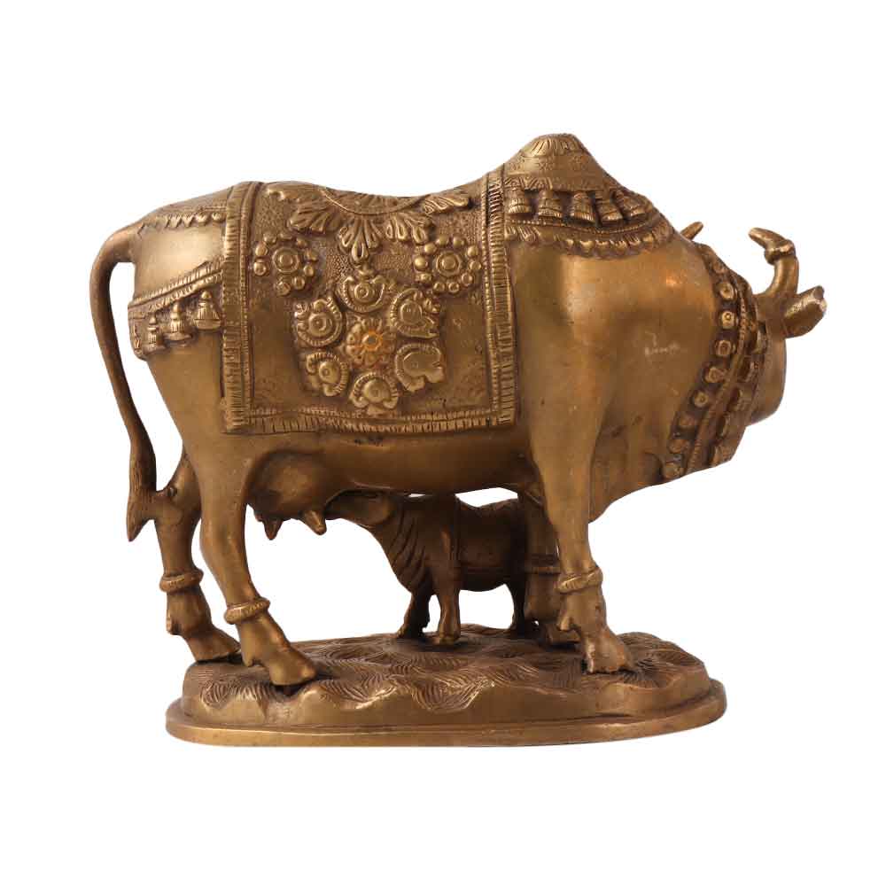 Increase health, wealth, positivity and peace in your life with this beautiful antique brass statue of a cow and calf. This statue is handcrafted by skilled artisans with intricate details and look amazing when placed on a table, desk or shelf. This embellished statue has been used for centuries for decoration and vintage collections. Cow and calf statues are considered sacred in Hinduism, so it's a perfect gift for Deepavali, New Year, corporate ceremony, birthday, anniversary, wedding or auspicious function for your brother, sister, friends, cousins or relatives.