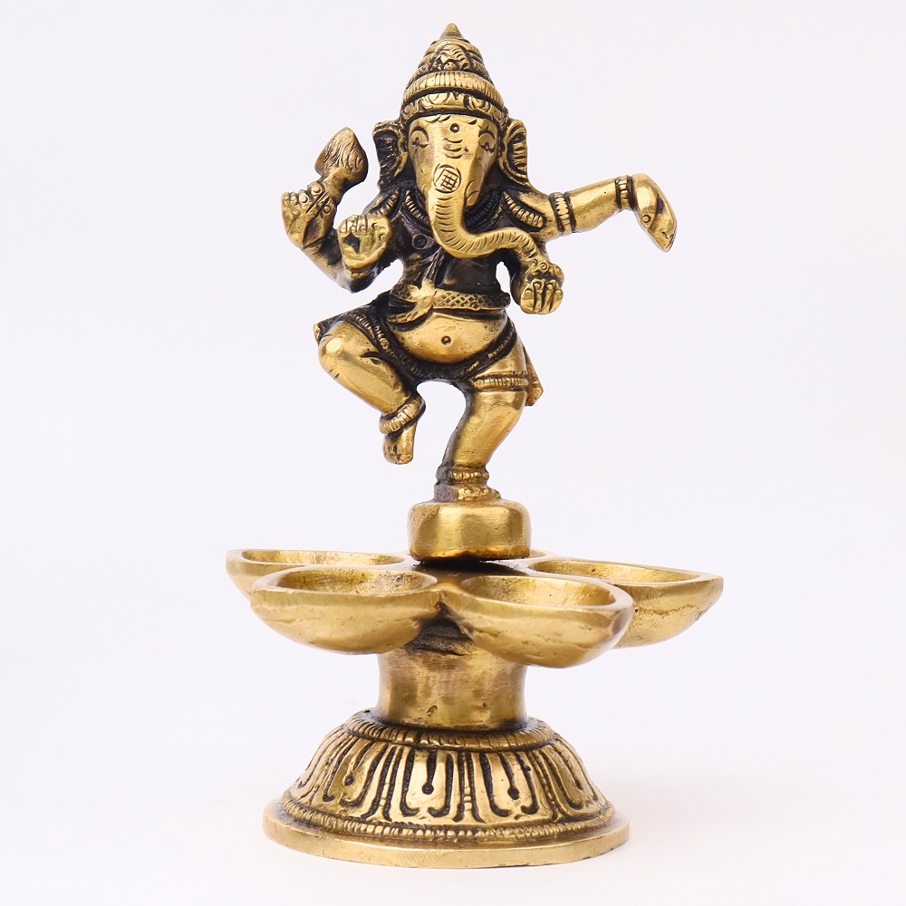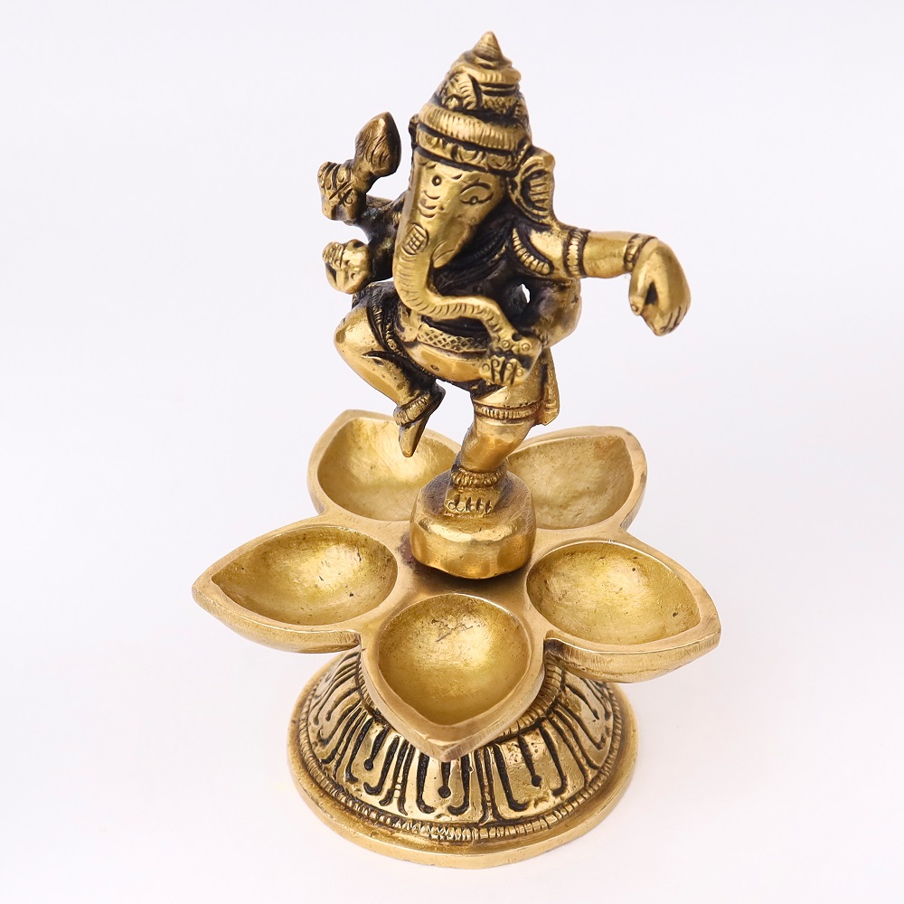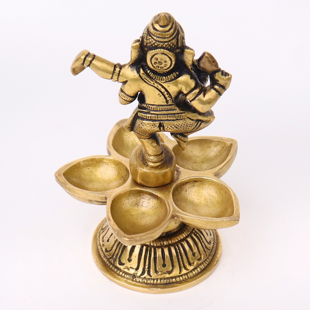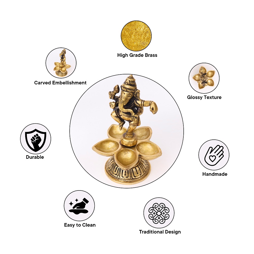 Celebrate devotion and artistry with this Brass Dancing Ganesha Five Wicks Oil Lamp, handcrafted in radiant golden brass. Featuring Lord Ganesha in a dancing pose atop a beautifully designed base, it combines divine symbolism with practical multi-wick lighting. Perfect for temple rituals, festive aartis, and auspicious gifting, this diya brings blessings, prosperity, and vibrant illumination.