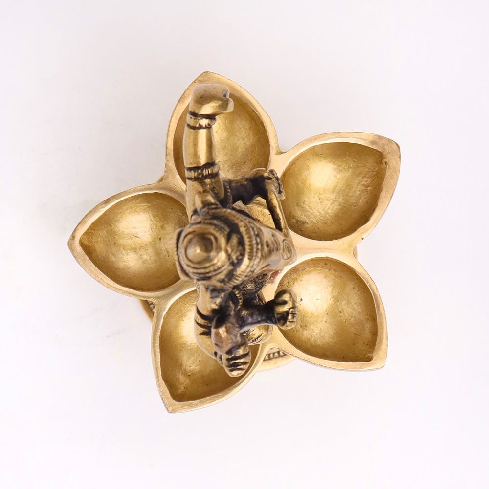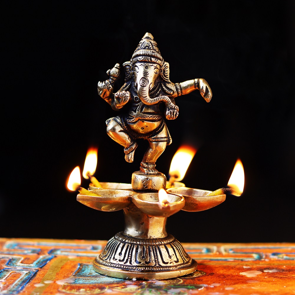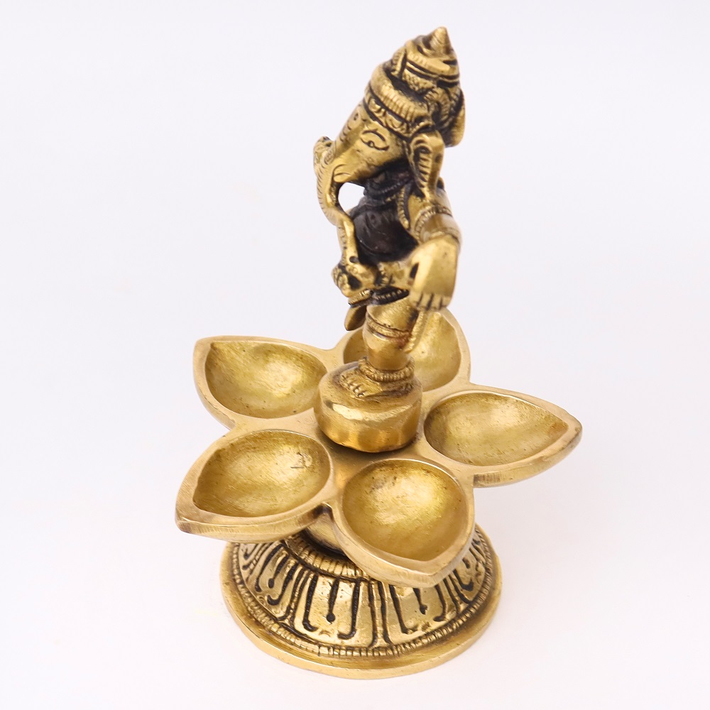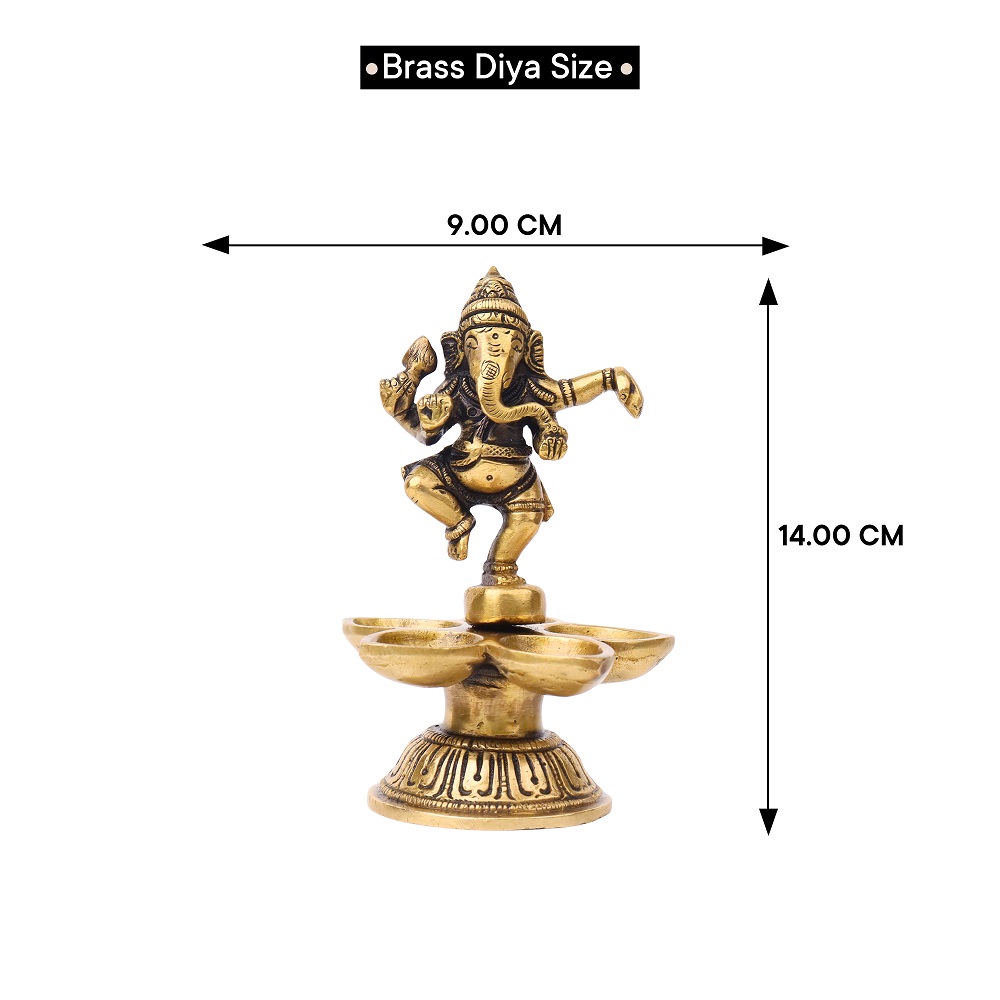 Celebrate devotion and artistry with this Brass Dancing Ganesha Five Wicks Oil Lamp, handcrafted in radiant golden brass. Featuring Lord Ganesha in a dancing pose atop a beautifully designed base, it combines divine symbolism with practical multi-wick lighting. Perfect for temple rituals, festive aartis, and auspicious gifting, this diya brings blessings, prosperity, and vibrant illumination.