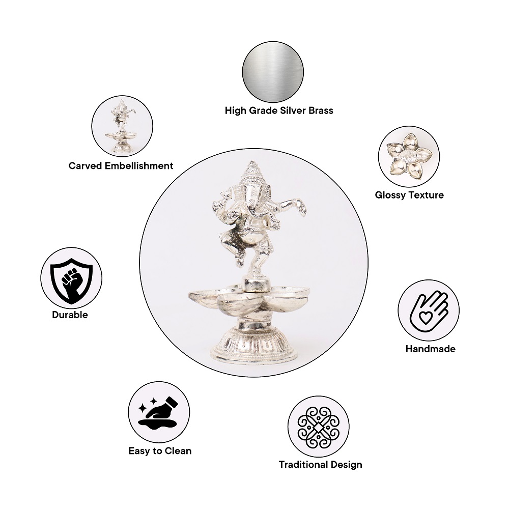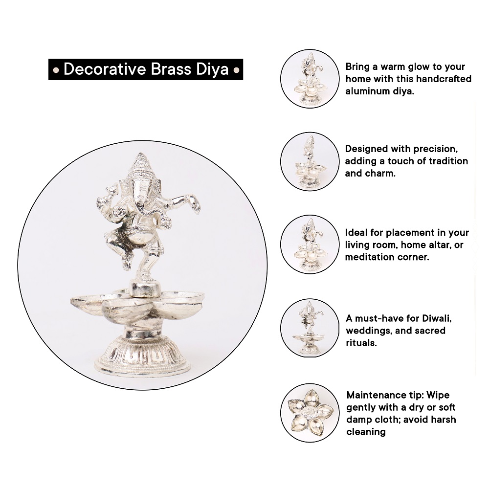 Indianshelf.com for bulk/wholesale orders.Indianshelf.us for personal purchases.Celebrate devotion and artistry with this Brass Dancing Ganesha Statue with Five Diyas in Nickel Finish, a sacred décor piece that radiates positivity and charm. Crafted in solid brass with a silver-toned nickel polish, this piece combines the grace of Lord Ganesha’s dancing posture with the radiance of five diya holders. Its detailed carving and lustrous finish make it both a spiritual centerpiece and an elegant accent for temple décor, festivals, and auspicious occasions.