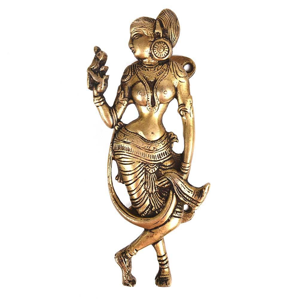 Brass Statue of Lady with Parrot Sitting on Her Arm Reminds of the Indian Tradition, the Ladies of the Royal Family Were Decked with the Traditional Dresses, Parrots and Other Birds. Ideal for Drawer, Dresser, Cabinet, Wardrobe, Cupboard and Almirah.