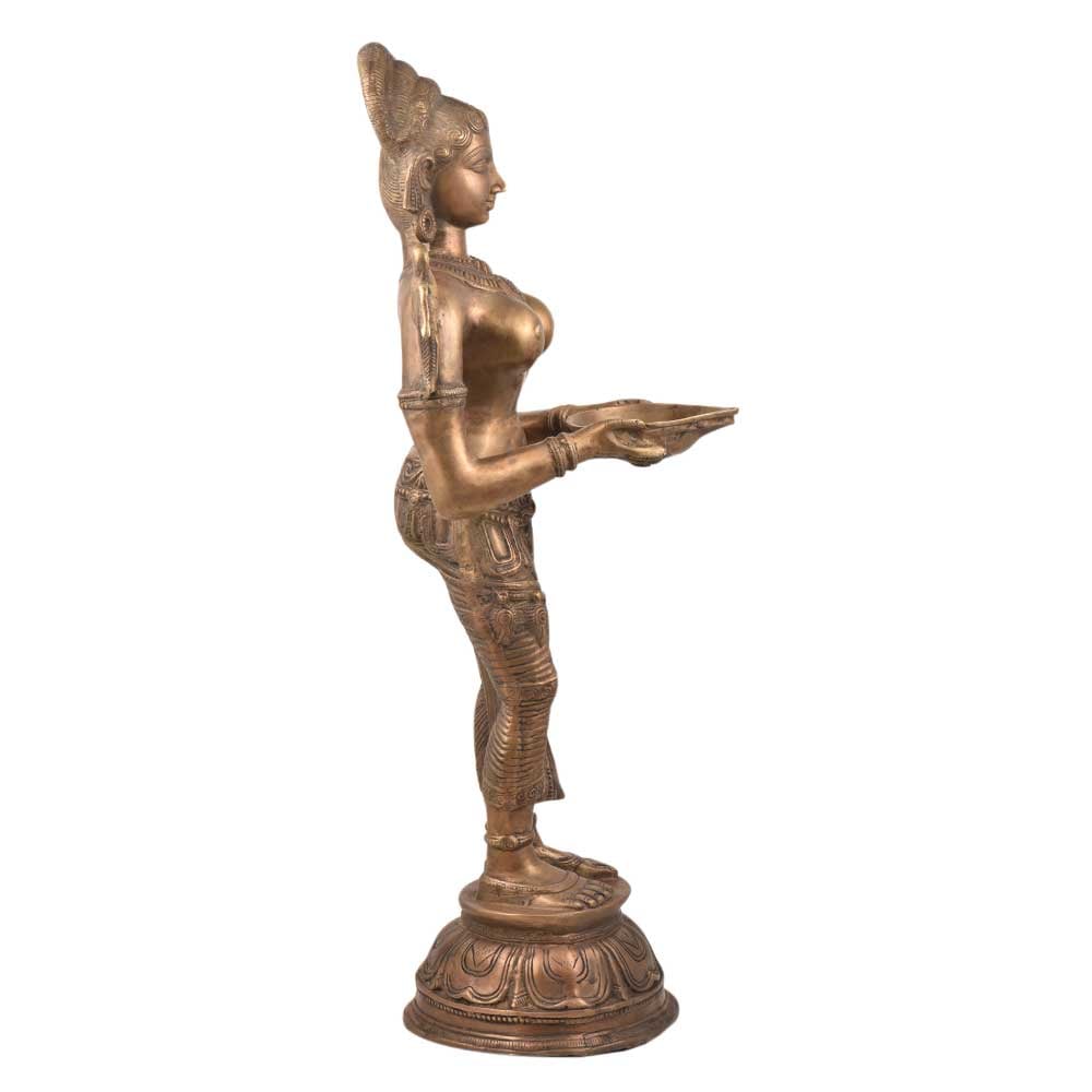 Indian Brass Oil Lamp is a traditional oil lamp known as a diya with a lady figurine. Used since ancient times as a decoration and a source of light, the diya is an oil lamp that burns vegetable oil or ghee Indian butter. You can also use them as decorations in your home in the living room or bedroom or place them on a dining table instead of candles.