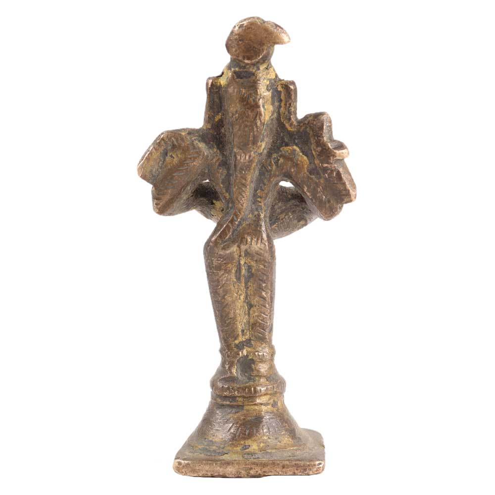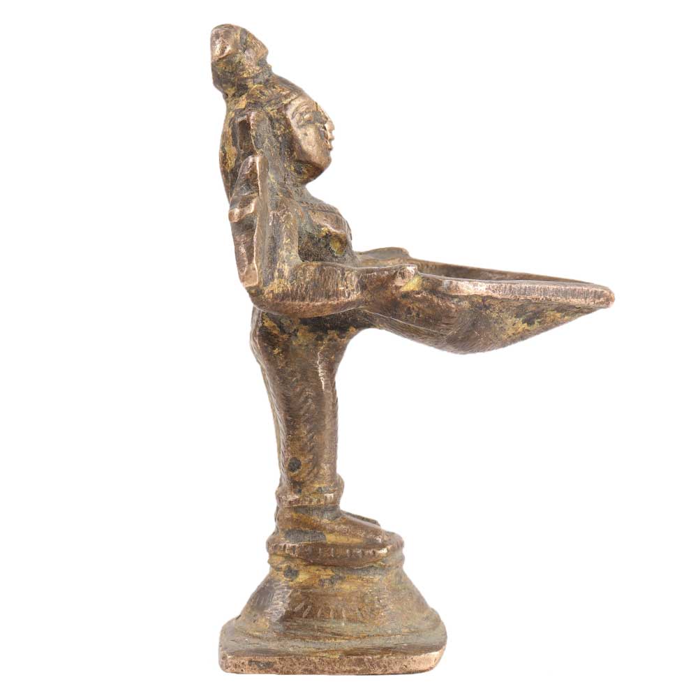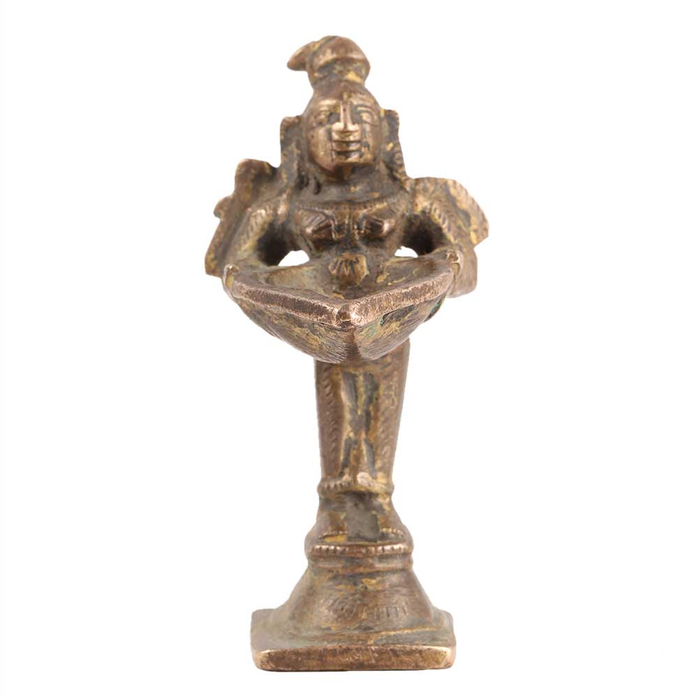 This antique lady lamp (also known as 'Paavai Villakku' or Deepalakshmi) is from Tamil Nadu. The work on the piece is old, and the specifics in the dress, hairdo, ornaments, and bird on the shoulder is exquisite. This lamp is available in a variety of sizes, ranging from very small to nearly life-size. Large stone versions of this lamp can also be found in Hindu shrines and temples in Karnataka, Tamil Nadu, and Kerala, particularly at the base of columns and flanking temple entrances.