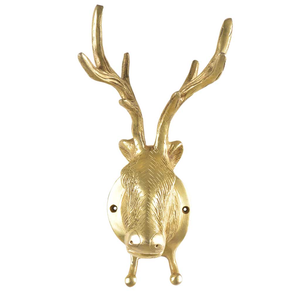 The sculptural deer or elk head with antlers makes this more than a hook—it’s wall art that doubles as practical storage.