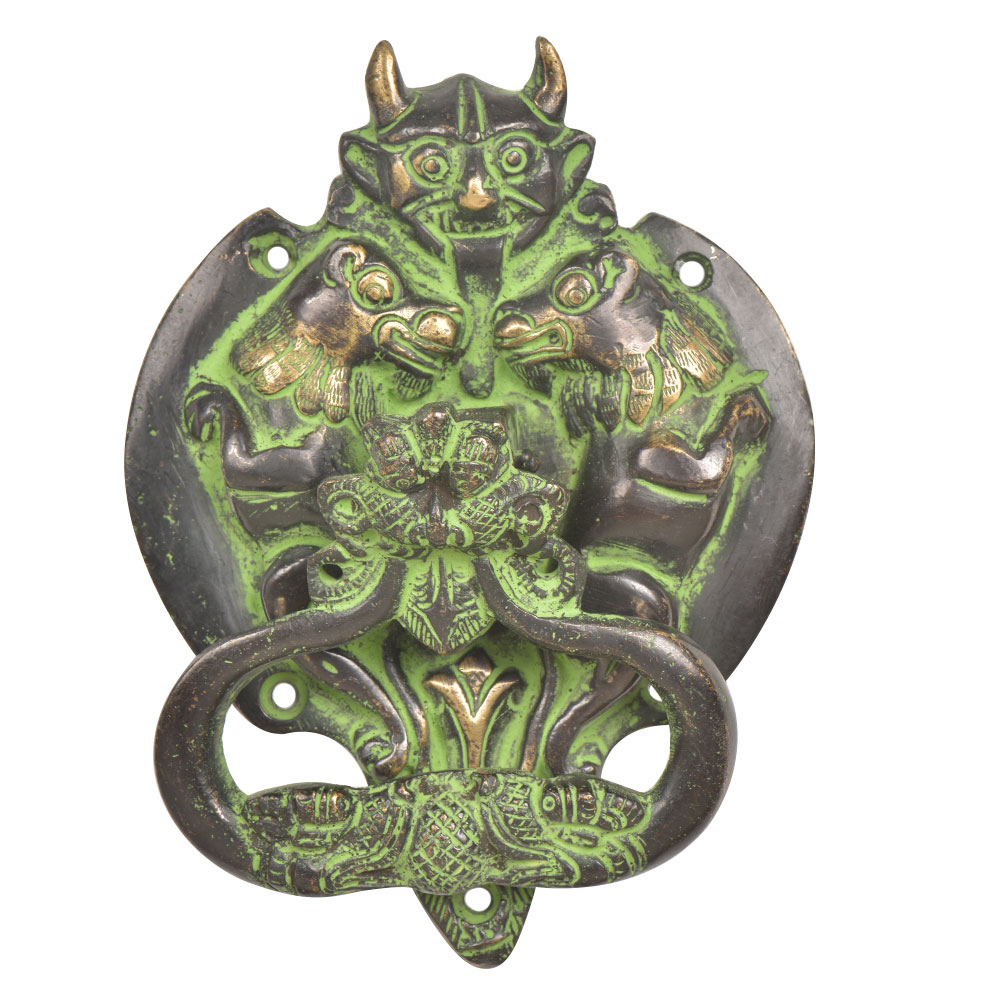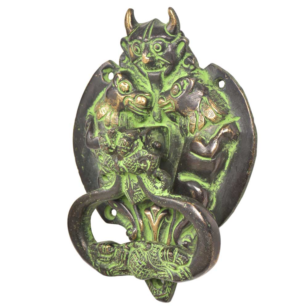 Brass Demon Two Elephants Dragon Head Door Knocker With Green Patina