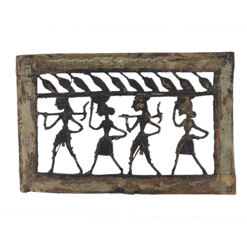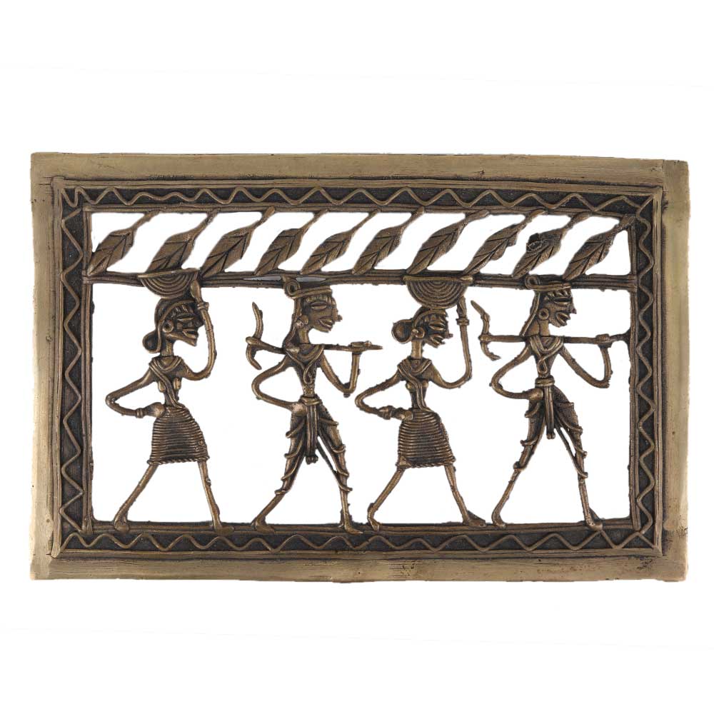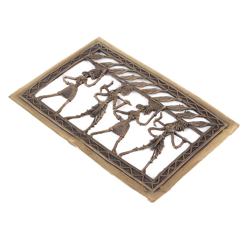 • Brass Dhokra Art Hanging Tribal Dancing Troupe Leafy Border On Top