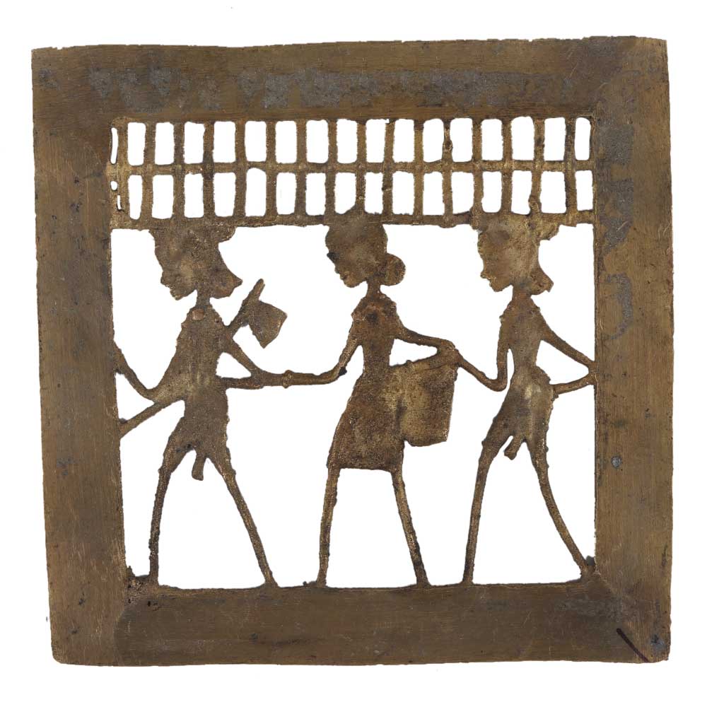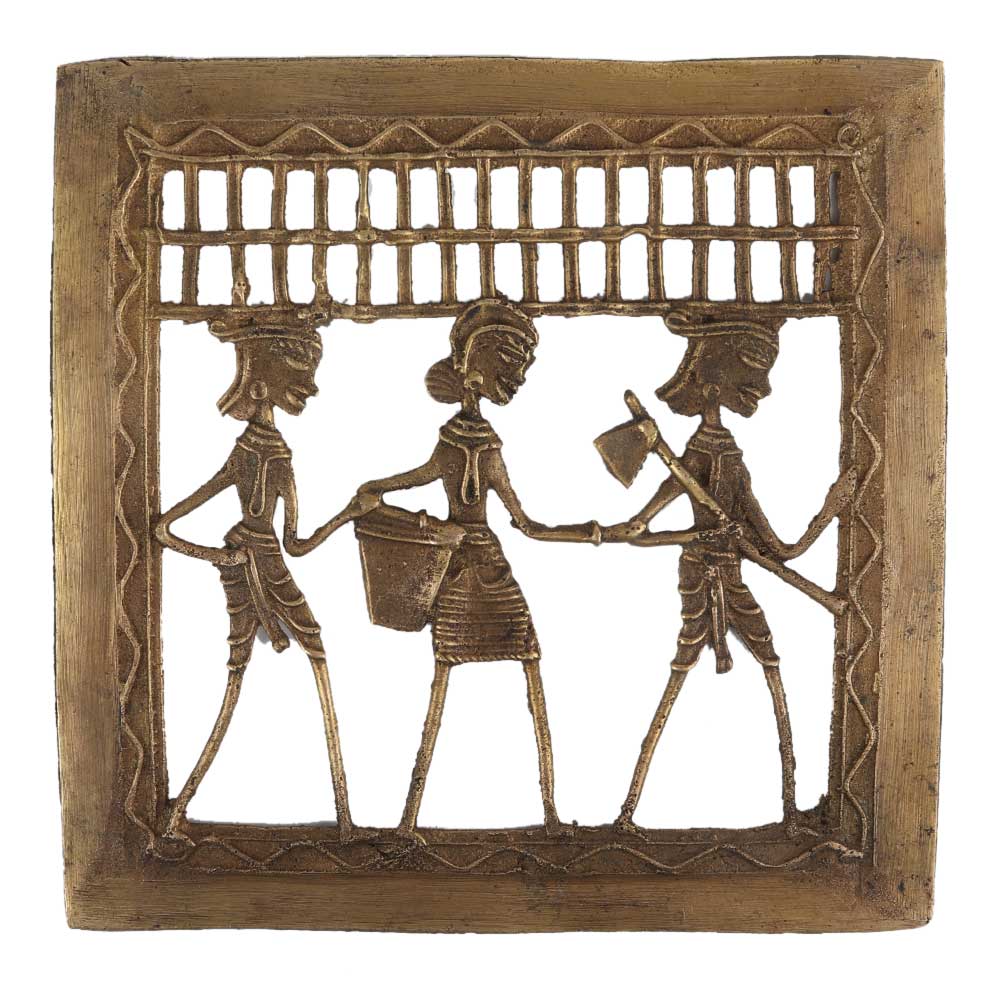 Brass wall dhokra art hanging of a farmer with two farmer and a lady holding a basket the farmer holds his axe and they are off to fields . These are daily routine of tribal couple of the dhokra tribe . Home decoration, office decoration, school decoration, gallery decoration . Gift it to your near and dear ones.