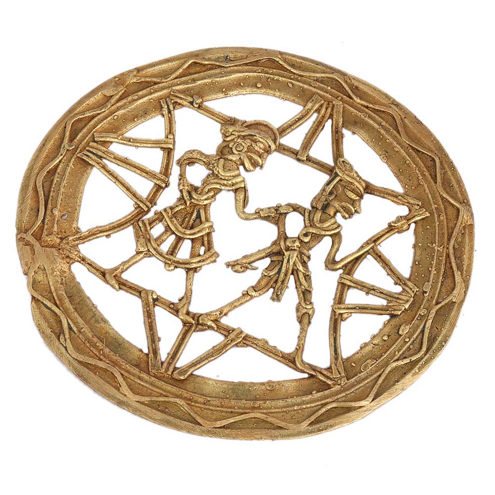 Brass Dhokra Decorative Wall Art Tribal People Hunting with intricate lattice ornamentation and intricate design with a round frame. framed or simply mounted on the wall or just placed on the table against the wall. Wedding gift, anniversary gift, house warming gift for your friends and family.