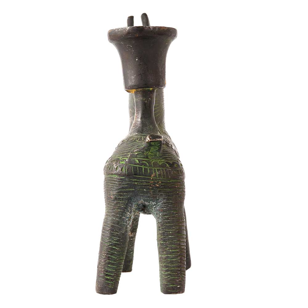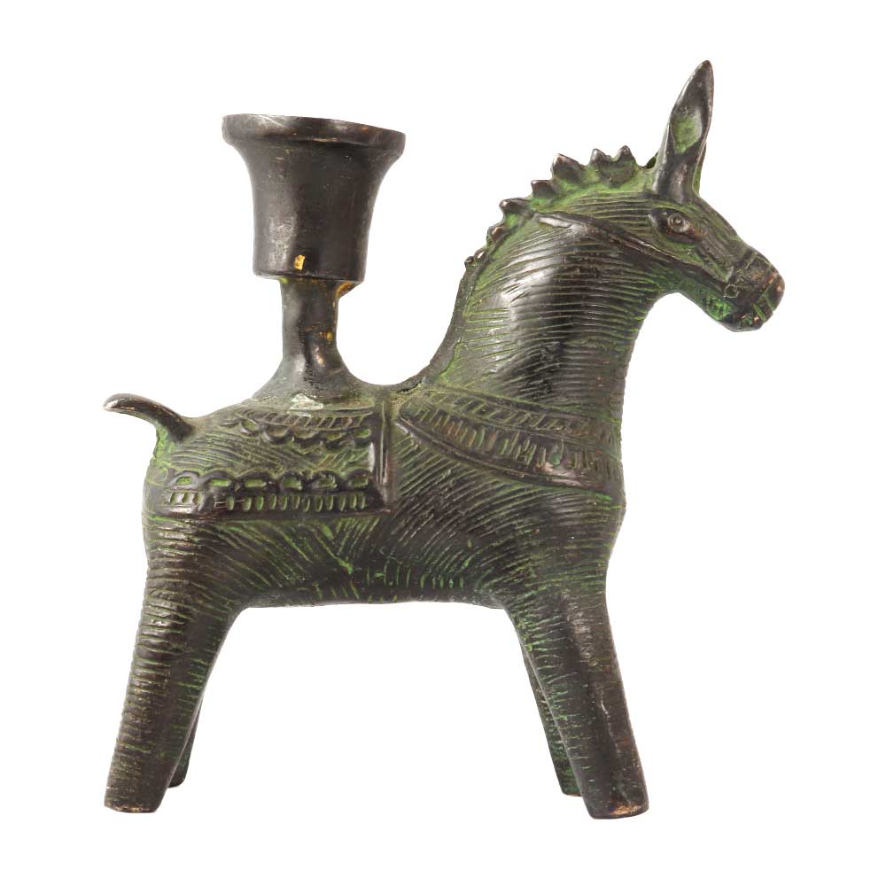 Brass horse candlestands in Dokra are unique and intricate works of art crafted by the Dokra artisans of India. Dokra is a traditional metal casting technique that involves creating a wax model of the object, coating it with a clay mixture, and then melting the wax to create a hollow mold for casting the metal. The brass horse candlestands are known for their detailed horse figures, which are intricately carved and molded by hand. The candlestands are not only functional but also serve as decorative pieces, adding a touch of elegance and charm to any room. These candlestands have become popular among art collectors and enthusiasts worldwide and are a testament to the skill and creativity of Dokra artisans who have kept this ancient craft alive for generations.