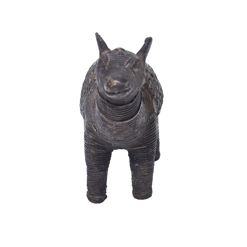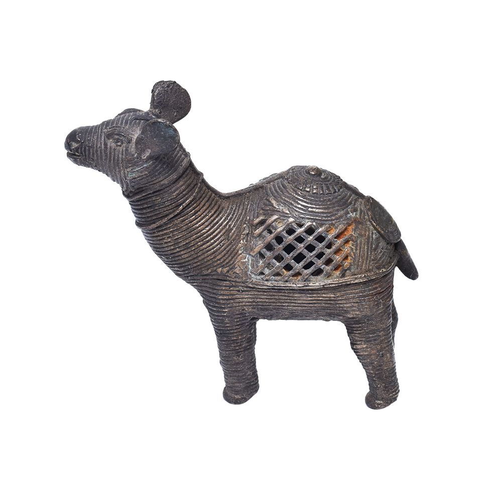 Brass Dhokra "Royal Camel" is a handcrafted metal figurine made using the ancient Dhokra art form of metal casting. Dhokra is a traditional tribal art form practiced by the dhokra damar tribe in India. This technique involves the use of the lost-wax casting method, where a wax model is covered in clay and then heated to melt the wax, leaving a mold into which the molten metal is poured. The resulting brass figurine is then polished and hand-finished to create intricate details and designs. The "Royal Camel" figurine is a beautiful representation of the magnificent desert animal, depicted with regal bearing and intricate details. It makes for a perfect decorative item for any space, and is a great way to bring a touch of Indian culture and heritage into your home.
