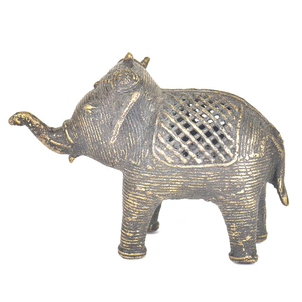 Dhokra art tribal elephant with patina is made of brass by the tribal or rural craftsmen of India. This elephant is beautifully made and it can be used as a paper weight or statement piece on your centre table or side tables of your drawing room.