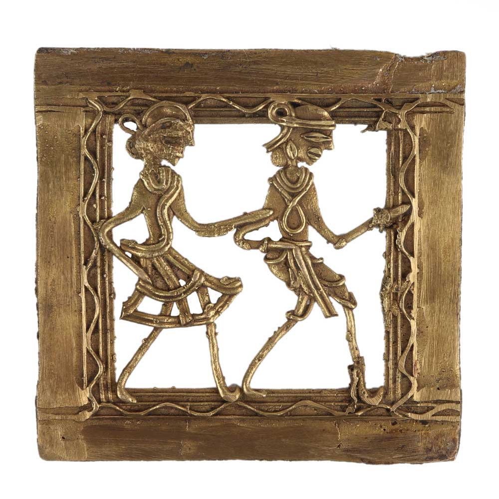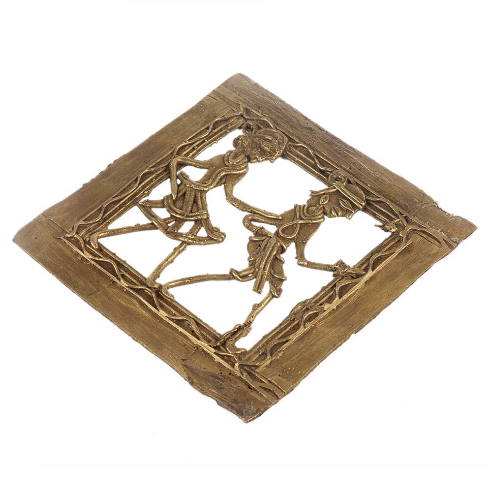 Hand crafted brass wall art hanging made by the tribal artist using traditional tools and methods of a couple performing a particular dance form . The couple are brass figurines framed in a square border. Home decoration, office and hotel decoration. Gift for friends and relatives during Diwali, New year, Christmas, house warming.
