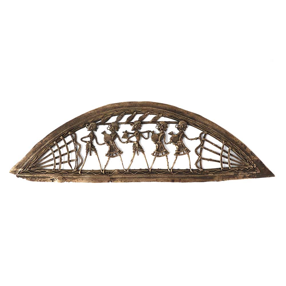 This inverted boat-shaped brass wall hanging combines aesthetics and practicality. This unusual wall art shows tribal farmers leaving for the fields in an inverted boat with jali work and tribal figurines. It would make a wonderful gift for a festival, housewarming, or corporate occasion, and your loved ones would adore it. Dokra wall hanging gives your decor more color and ethnicity. Whether it's for a holiday, housewarming, or corporate gift, your friends and family will adore this idea.