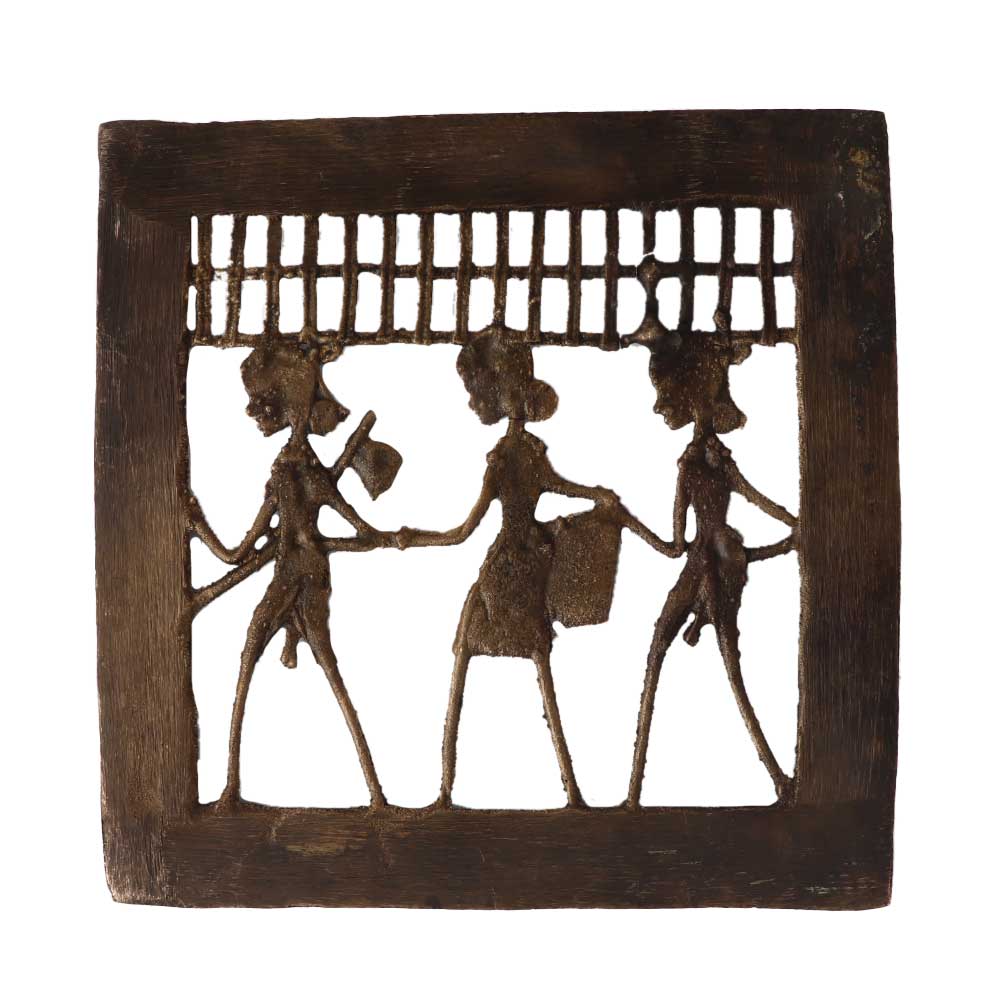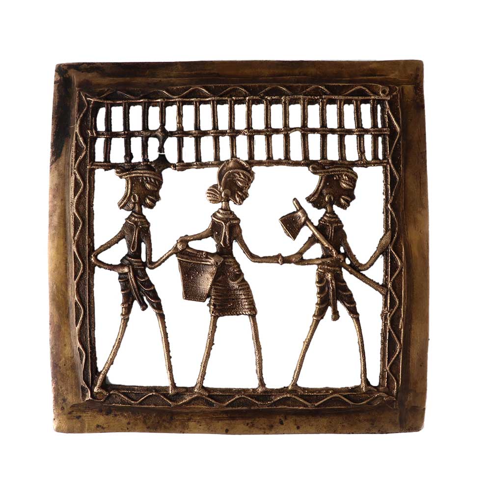 This ornamental brass square framed wall hanging of three farmers going to field for work is handmade. This warli jali or display piece of dhokra art is a symbol of handcrafted dhokra art.  Improve the aesthetic value of your home, place of business and hotel. Excellent for giving as a gift at weddings, anniversaries, housewarmings, new ventures, and award ceremonies. Dhokra craft is an ancient wax-casting method used by Indian tribal artisans to create dhokra art.