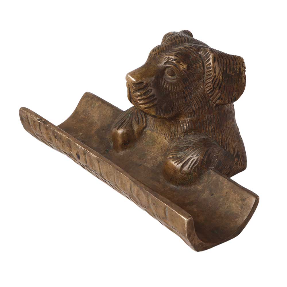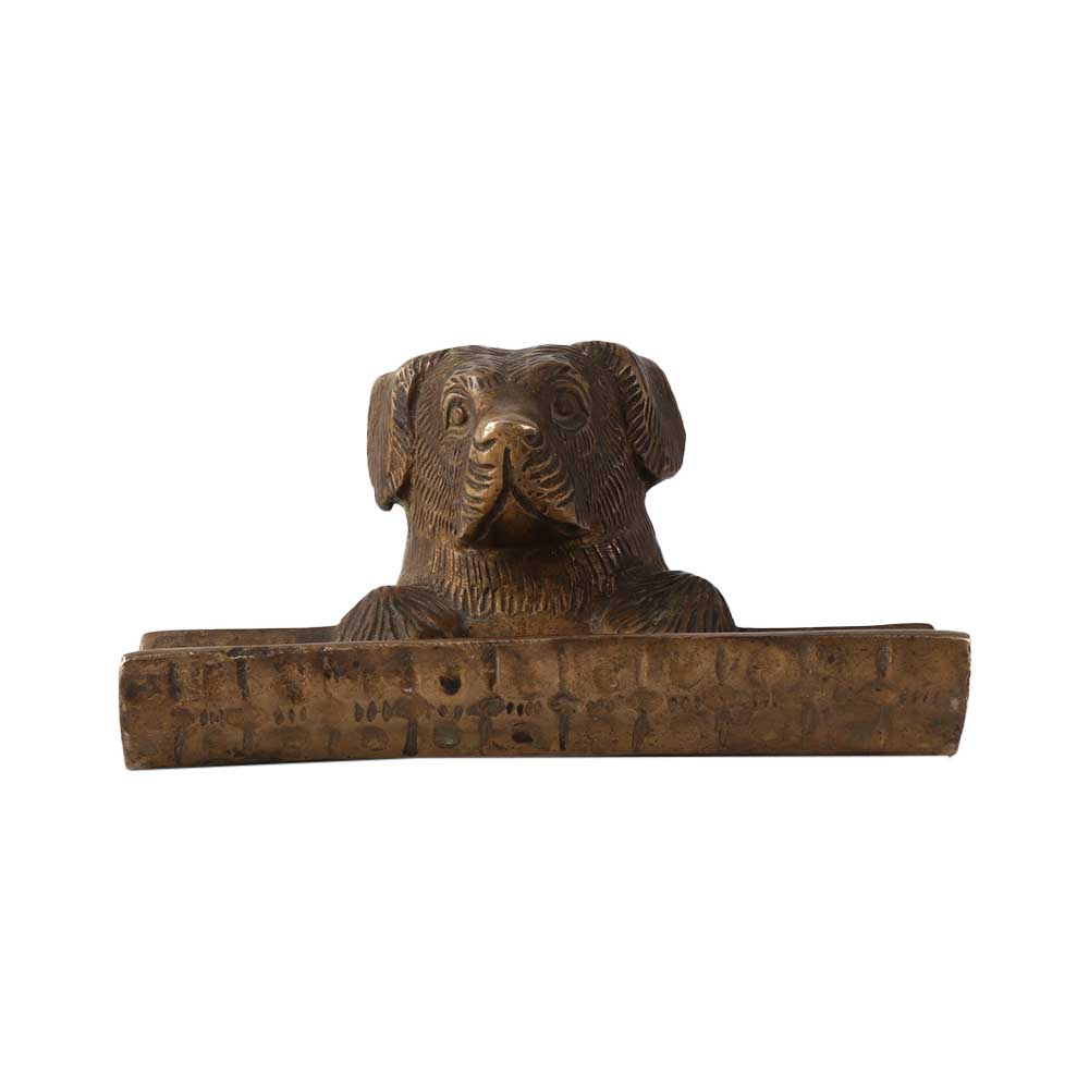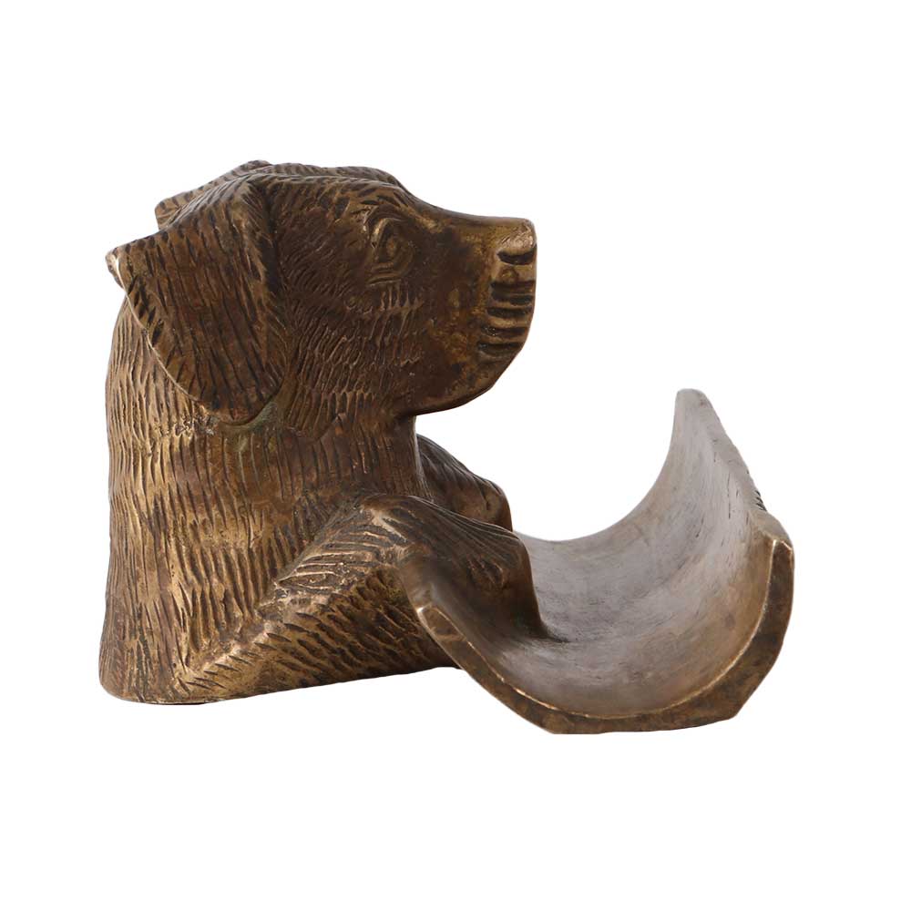 Brass paperweight or pen holder with carved dog head resting on wood in the Black Forest. This fascinating man's best friend is prepared to carry pens, pins, jewellery, or other stray objects. Excellent present for your friends, family, and close friends.