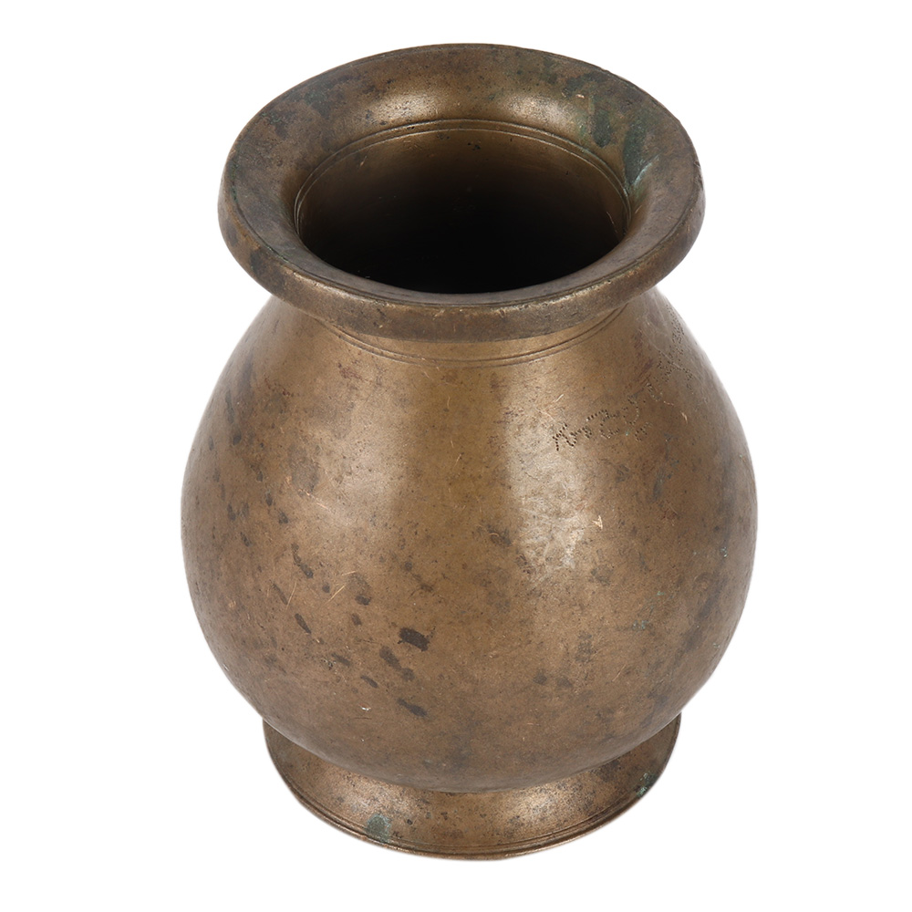 This pure brass south Indian pot features a bulging body and a flared mouth. It's perfect for decorating your house or business, as a corporate gift, or as a vase for your favorite friends and family members.