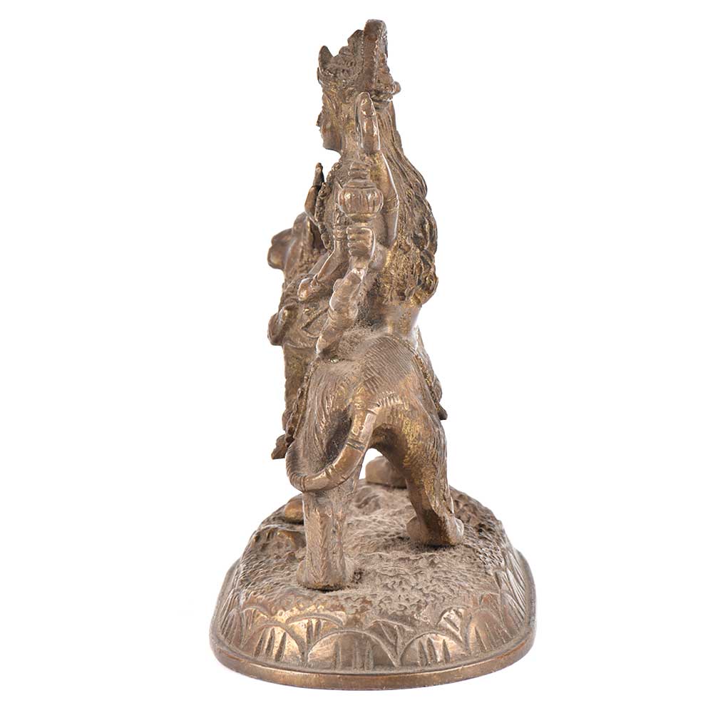 Durga is a form of Devi, the supremely radiant goddess, depicted as having eight arms, riding a lion , carrying weapons and a lotus flower, maintaining a meditative smile, and practicing mudras, or symbolic hand gestures. Ma Sherawali is finely depicted as sitting on a lion in a majestic manner.This brass sculpture of Hindu goddess Durga is meant for performing puja at home, or for simply decorating your home in Hindu way.