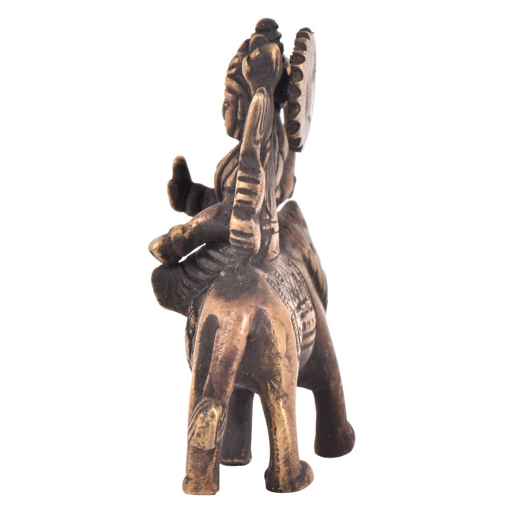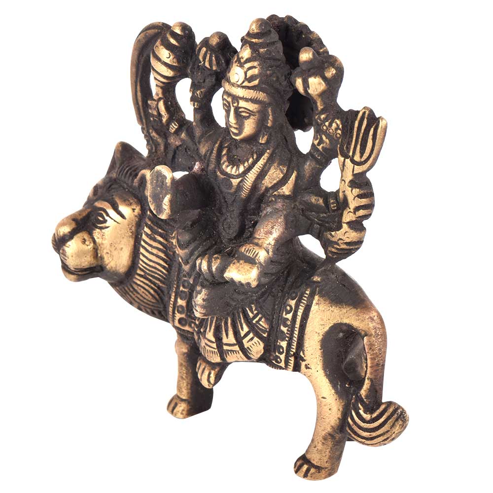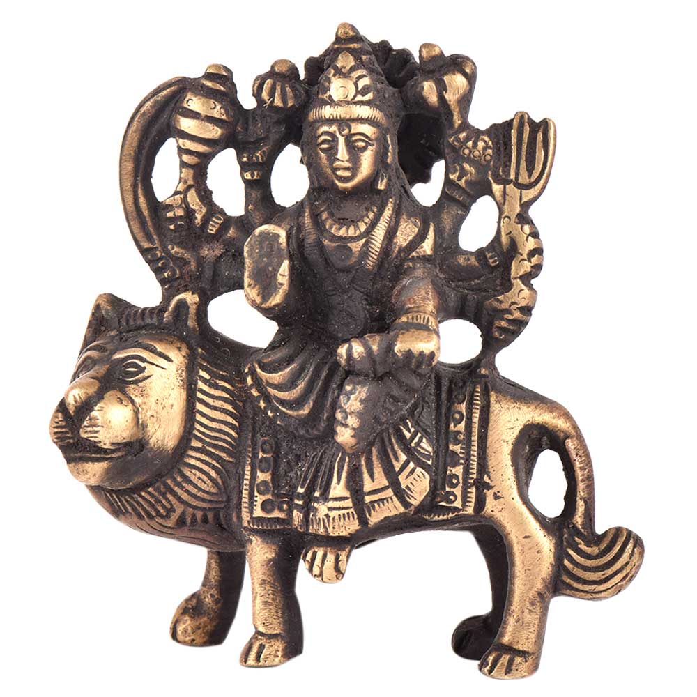 Durga is a form of Devi, the supremely radiant goddess, depicted as having eight arms, riding a lion , carrying weapons and a lotus flower, maintaining a meditative smile, and practicing mudras, or symbolic hand gestures. Ma Sherawali is finely depicted as sitting on a lion in a majestic manner.This brass sculpture of Hindu goddess Durga is meant for performing puja at home, or for simply decorating your home in Hindu way.