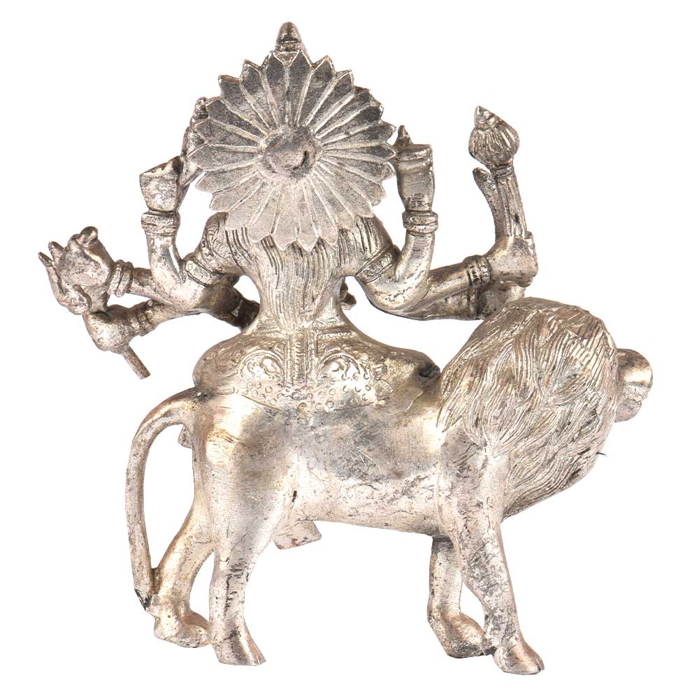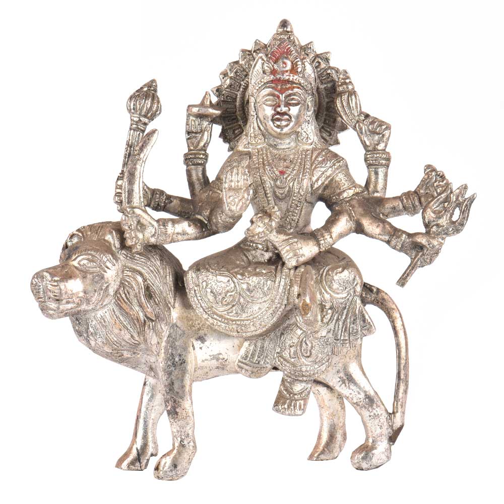 Durga Is a Popular Fierce Form of The Hindu Goddess Or Devi. She is Depicted with Multiple (Variously, From Ten Up to Thousand) Arms, Carrying Various Weapons and Riding a Ferocious Lion. She is Often Pictured as Battling or Slaying Demons, Particularly Mahishasura, the Buffalo Demon. Install this statue at home or office to draw inner strength and also to enhance your home decor .This statue comes with a silver finish.