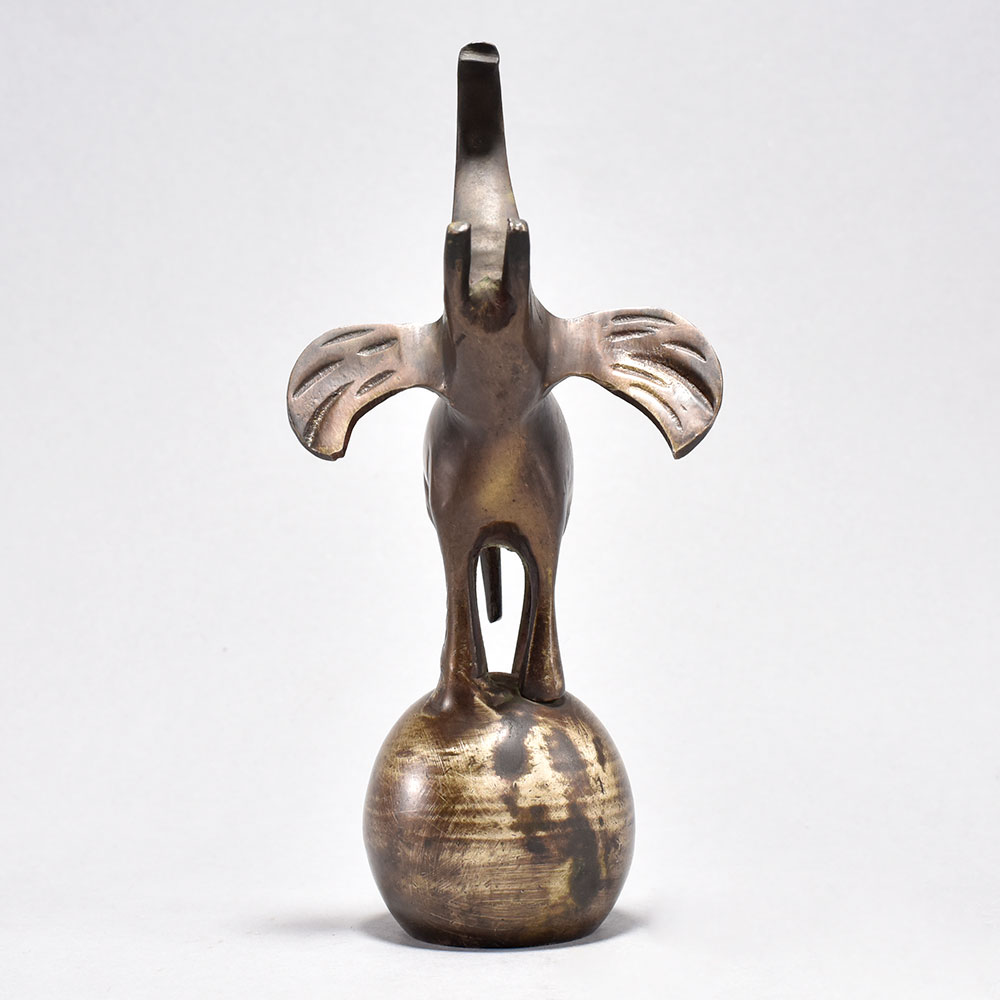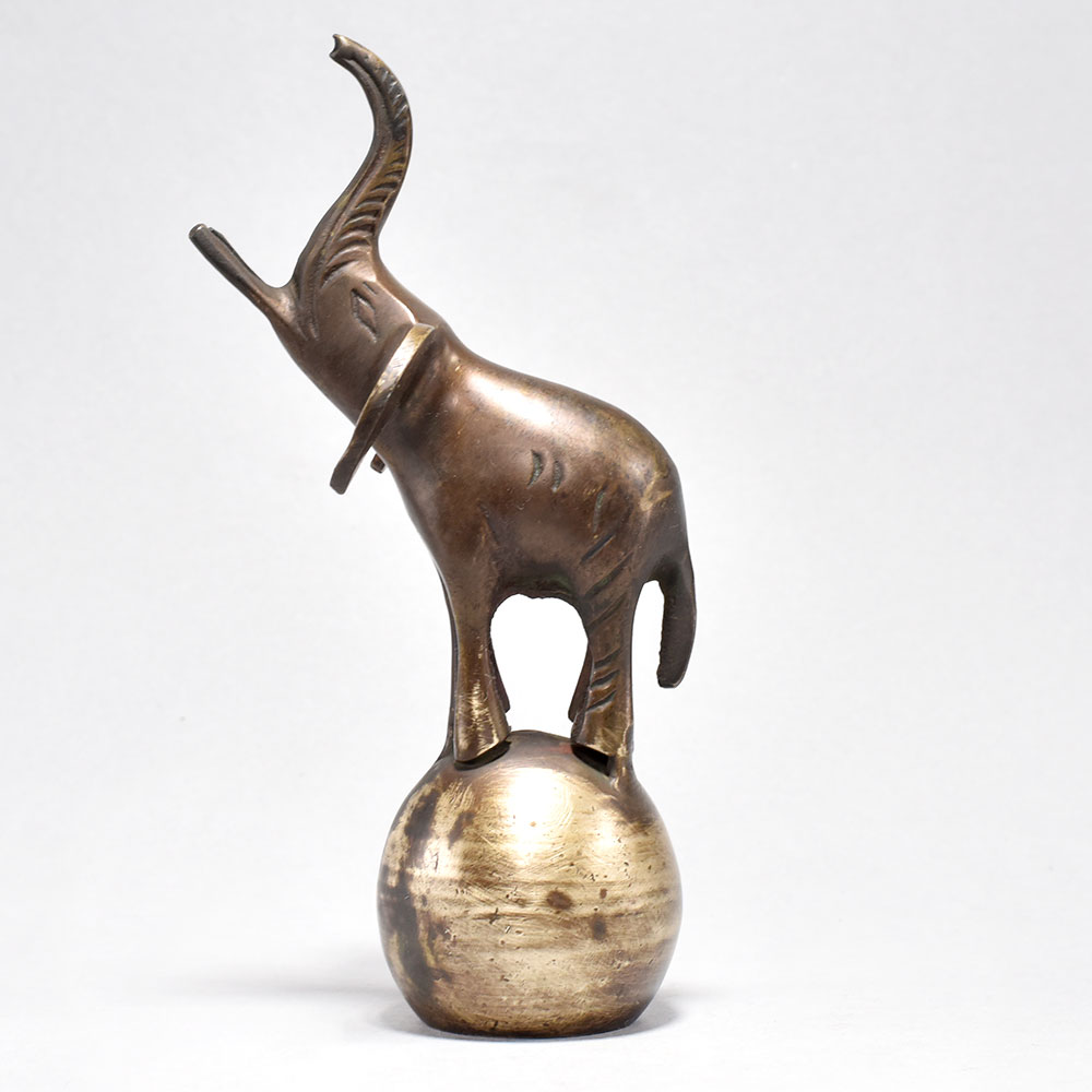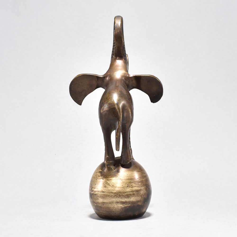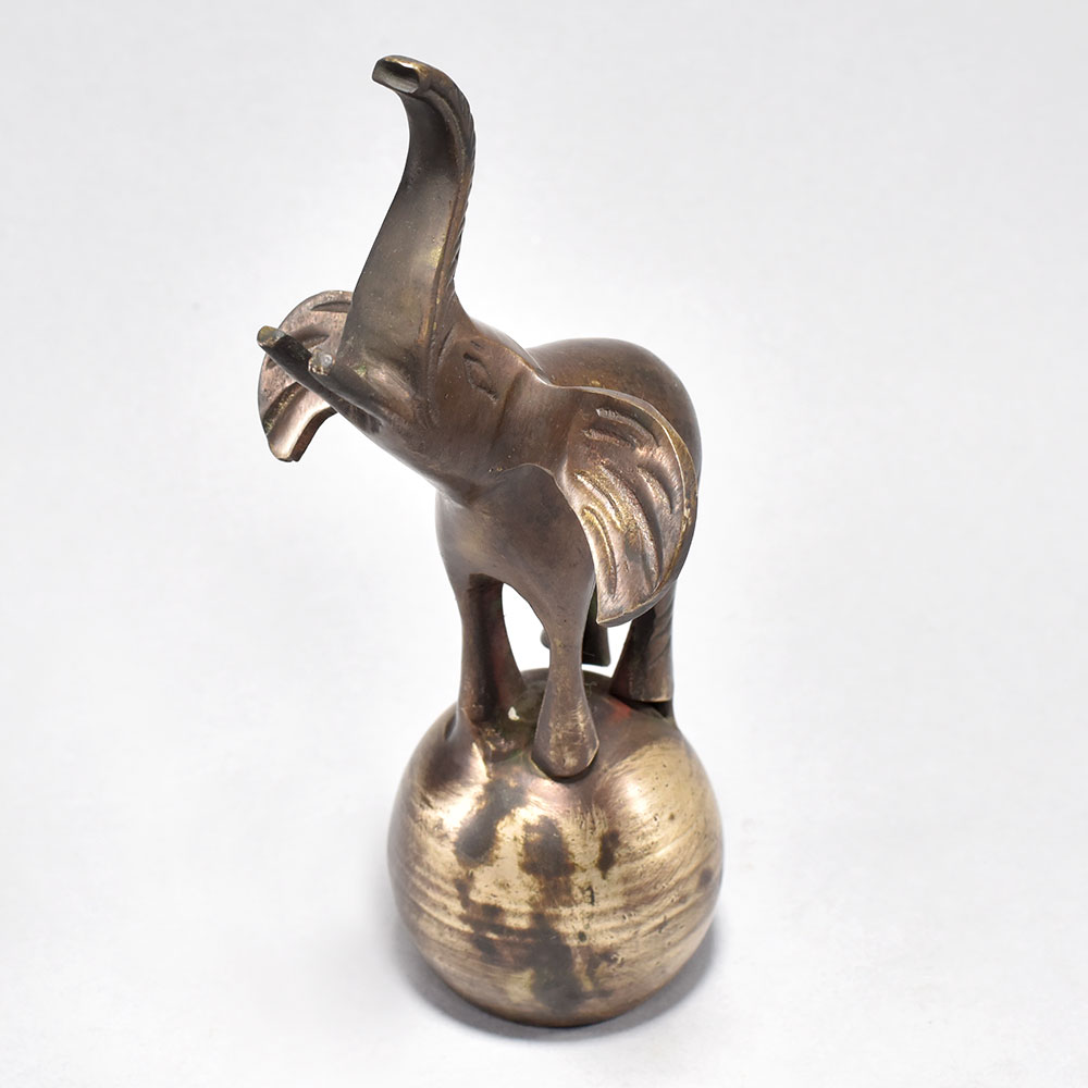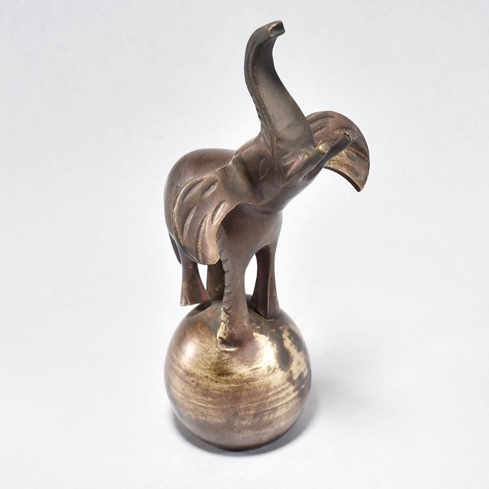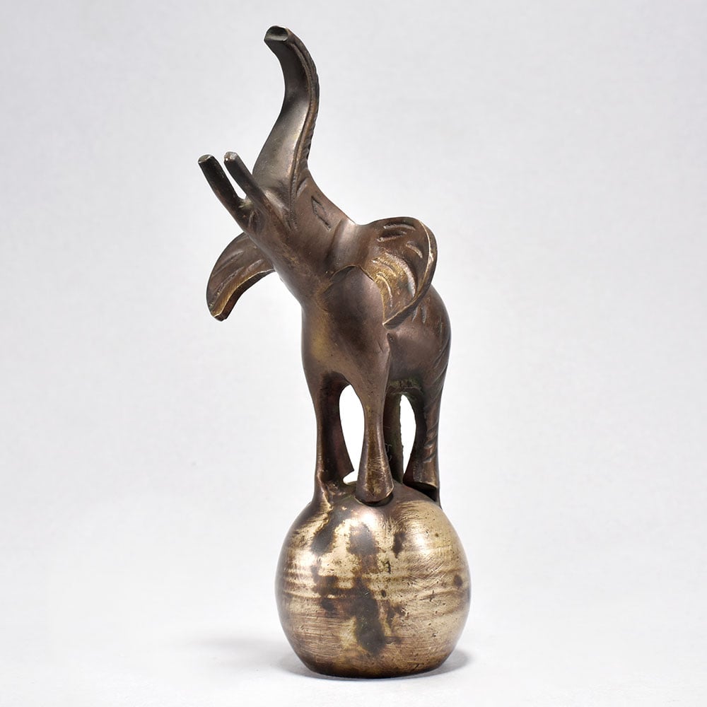 Majestic and Mystical - Bring the Wisdom of the Elephant Home Elevate your space with the captivating Brass Elephant on Ball Sculpture Vintage antique crafted with traditional Indian artistry Intricate, detailed carvings on the elephant's body Smooth, polished brass surface radiates an elegant glow Raised trunk is a symbolic gesture of greeting and good fortune This striking elephant figurine is more than just a decorative piece - it's a symbol of strength, wisdom, and luck in Hindu culture. The elephant stands atop a smooth brass ball, representing stability, balance, and the world itself. Display this stunning sculpture to infuse your home with an air of majesty and mystique, inviting good energy and positive vibes. Whether as a thoughtful gift or a cherished addition to your own space, this brass elephant sculpture will elevate your decor while honoring the revered symbolism of this noble animal. Embrace the wisdom of the elephant and let its presence inspire and uplift you.