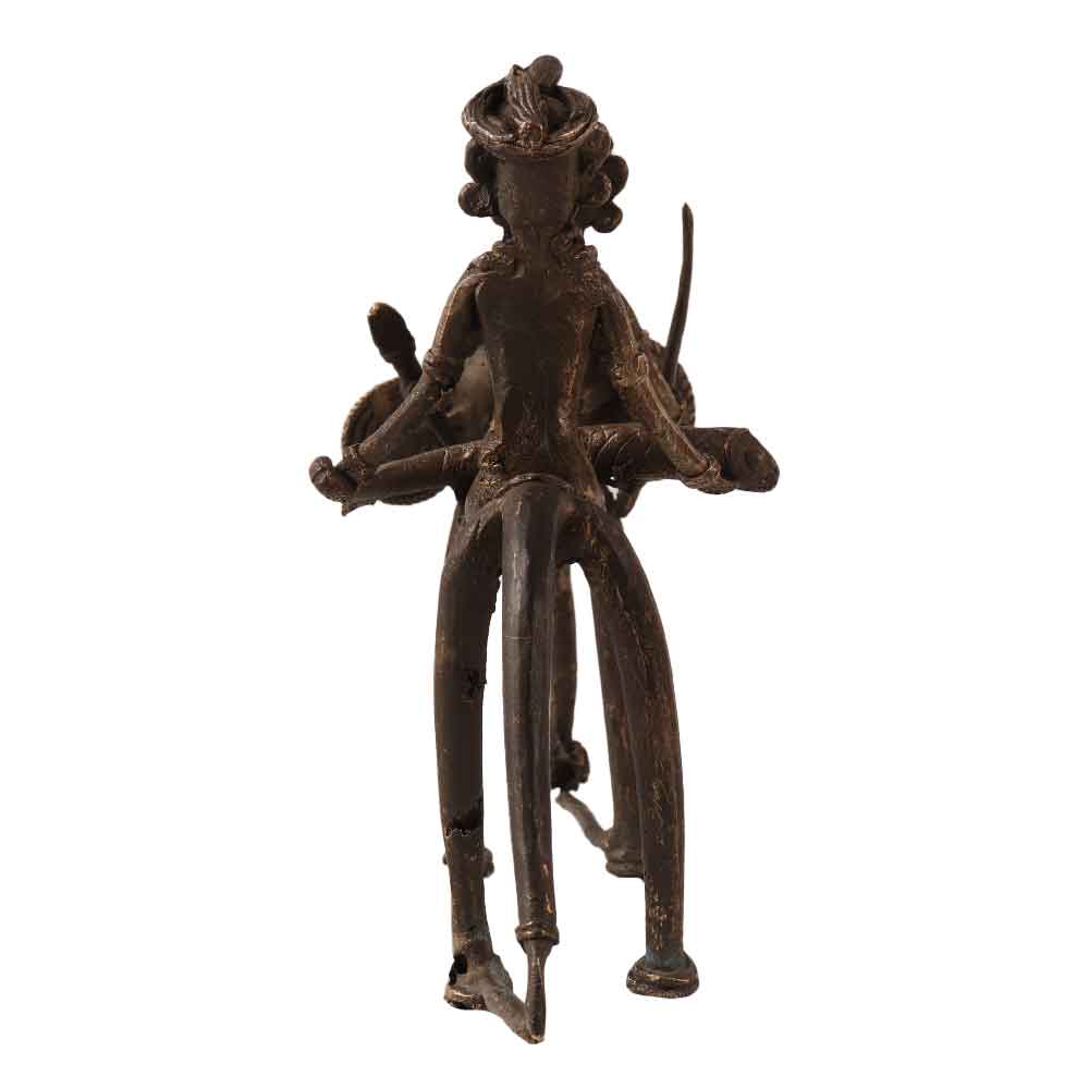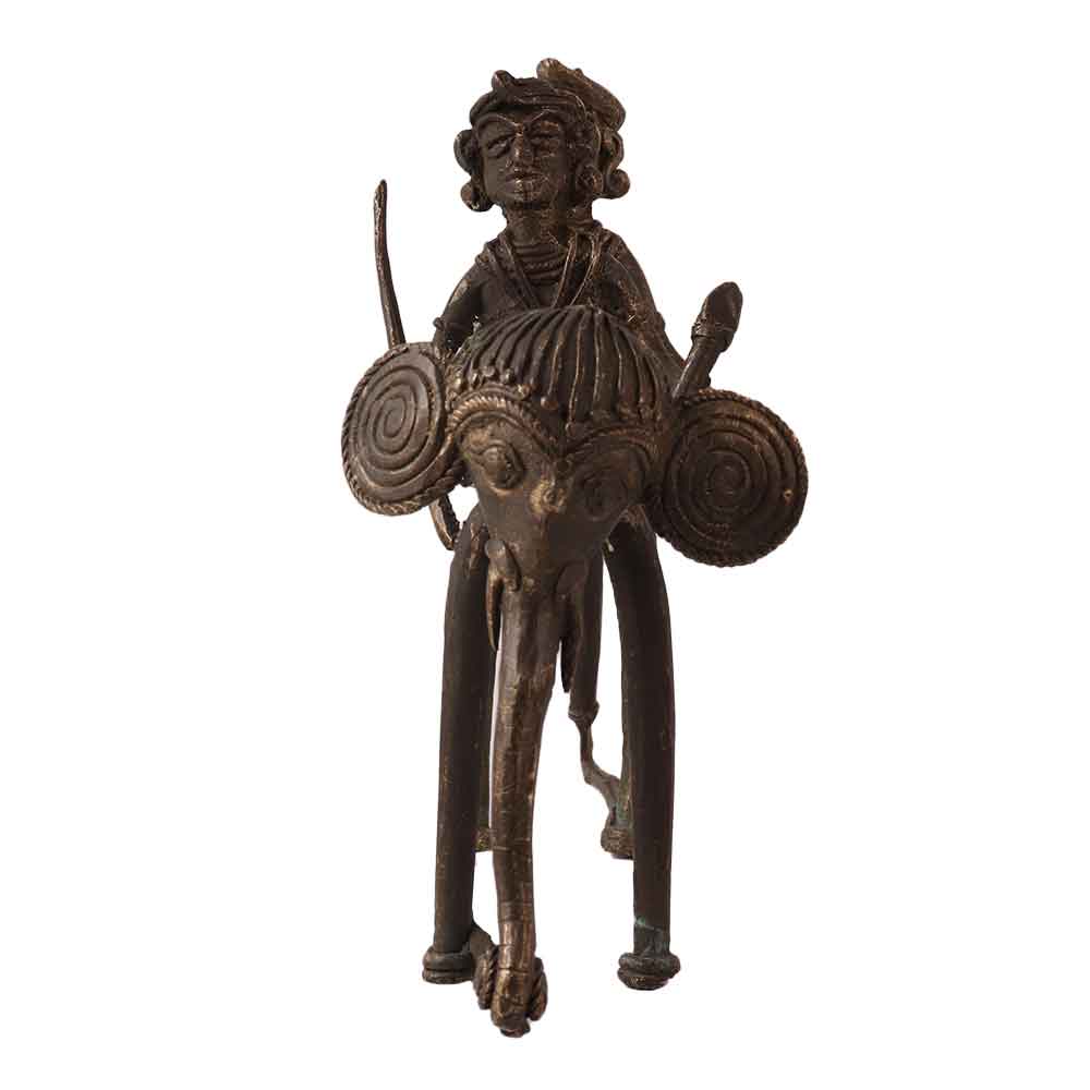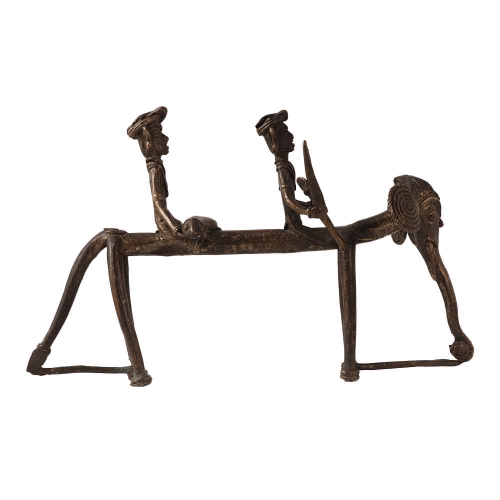 An antique brass elephant statue with 2 riders in tribal art. This handcrafted elephant statue is made by skilled craftsmen in antique brown finish. Its unique design sets it apart from other statues. For centuries, an elephant statue has been considered auspicious in the home, office or business, spreading positivity, prosperity and good luck. Place this antique brass statue on table, shelf, altar, desk or in your vintage collection. A great piece of art for vintage art lovers and decoration experts to enhance the decoration at home, stage or wedding.