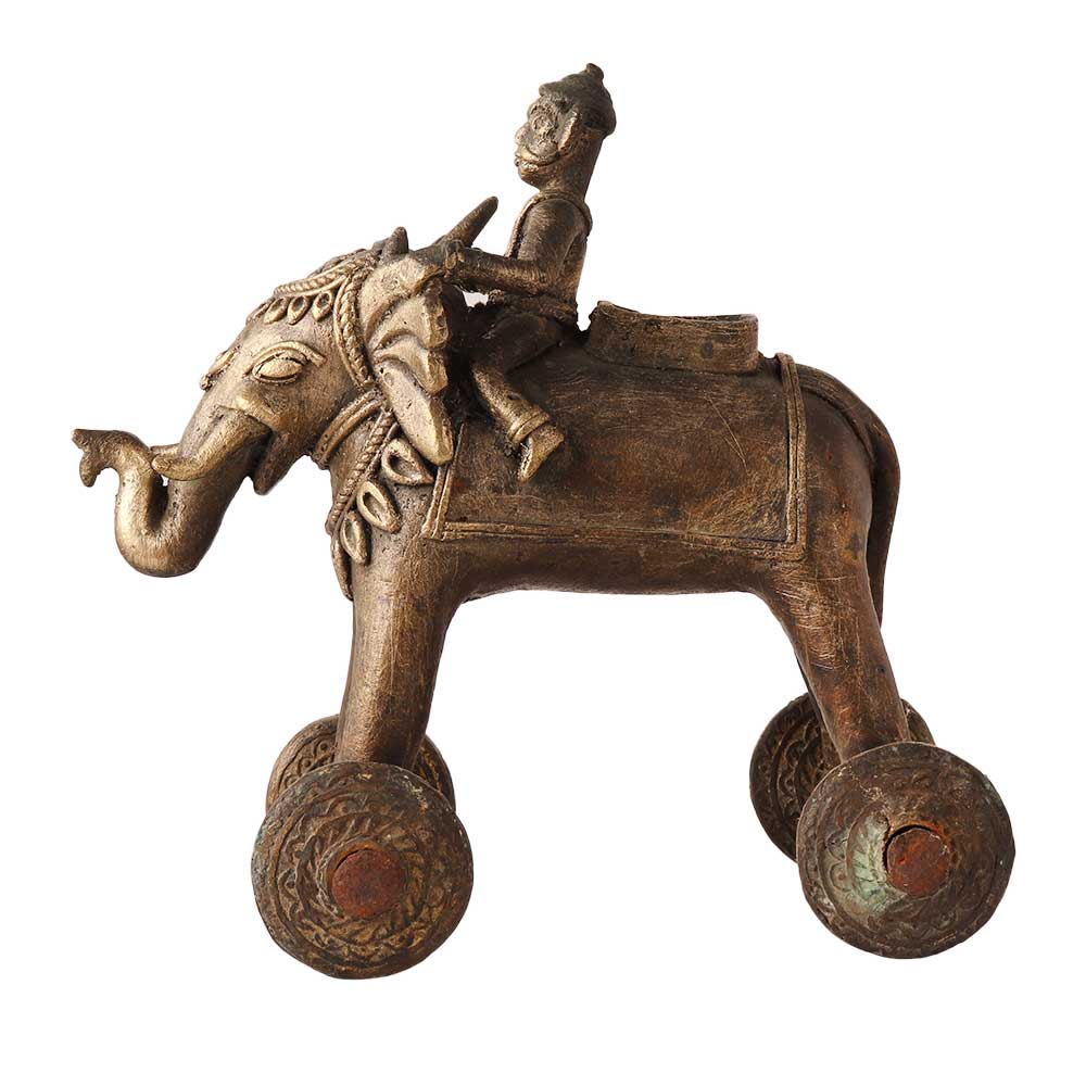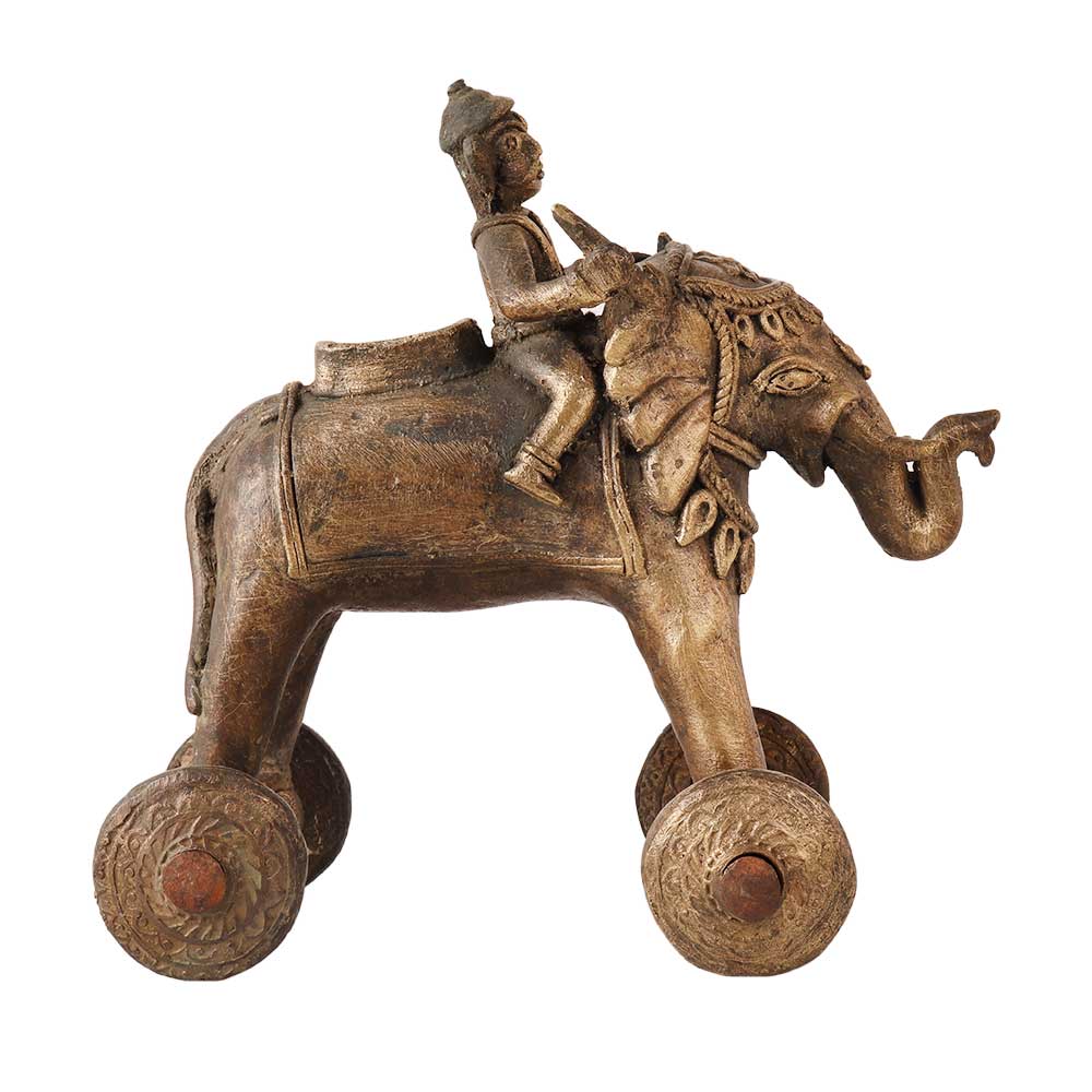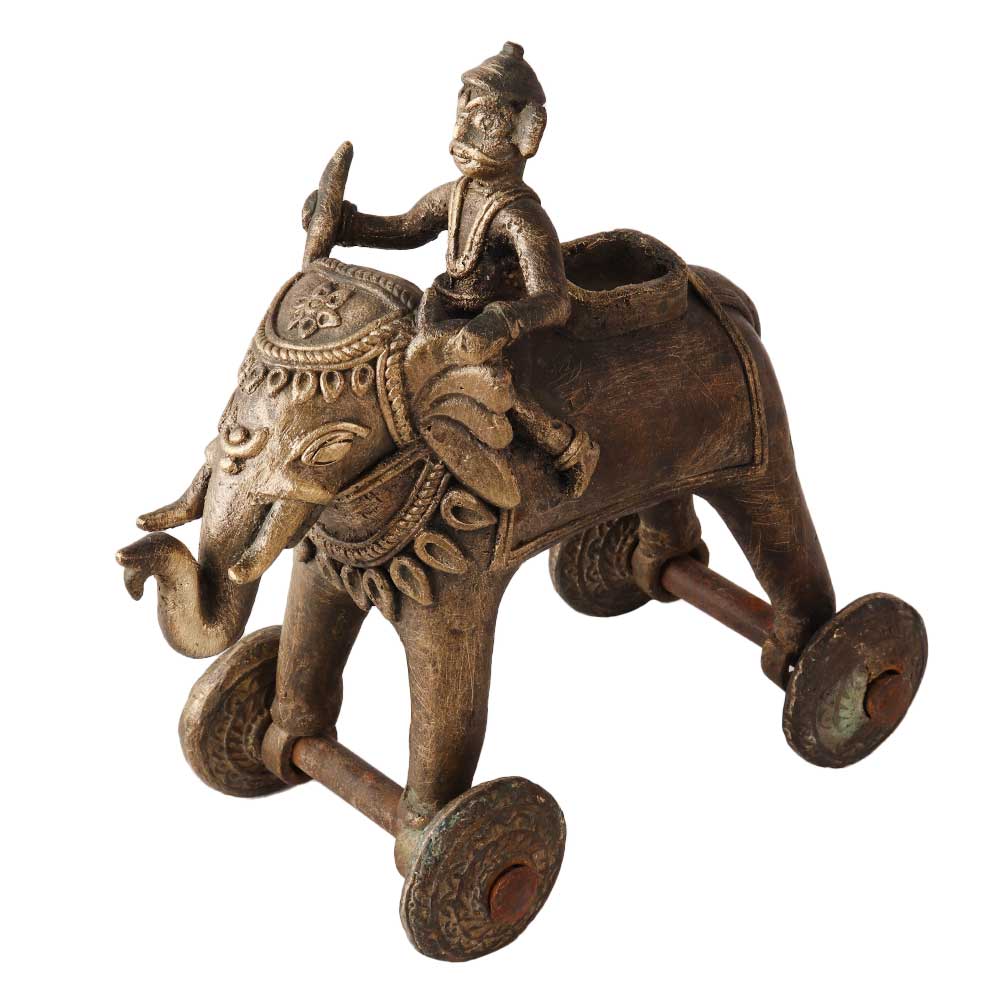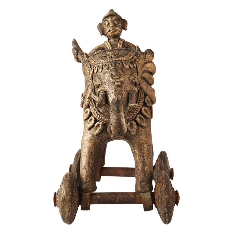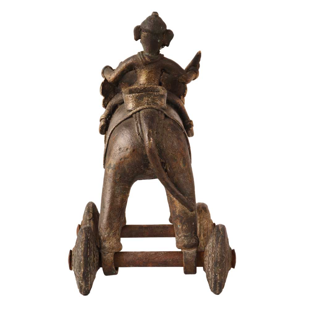 In Southern India, a brass elephant with riders on wheels is a common temple ornament. The toy is constructed of brass and has an exquisitely sculpted elephant on it that can walk around thanks to wheels on its feet. On the elephant's back are little figurines of riders and elaborate decorations. You may take the figures off and put them back on the elephant. These antique temple toys are frequently utilised in Hindu homes and temples as ornamental objects. They are also well-liked as toys among kids. A fascinating and interesting toy that encourages imaginative play and cultural understanding is the elephant with riders on wheels. It is a stunning addition to any collection or home because to its elaborate design and fine craftsmanship.