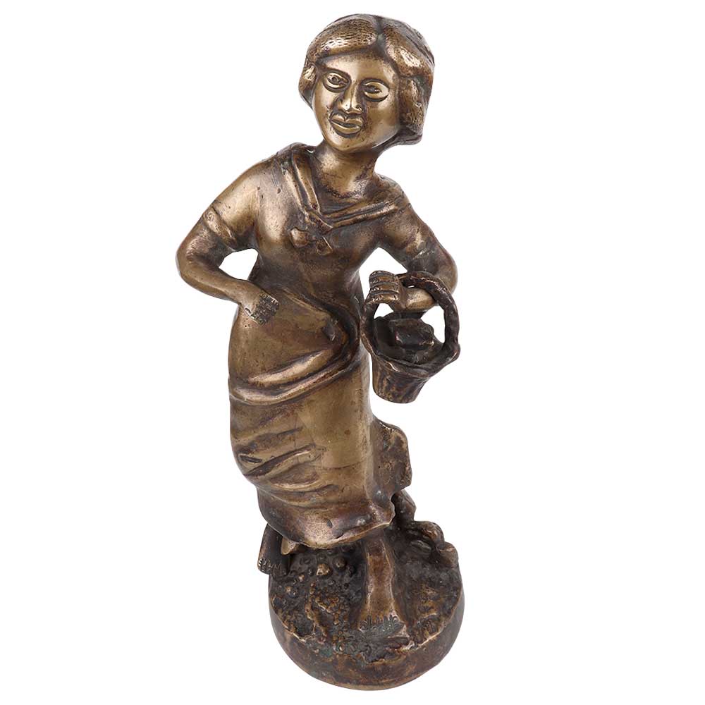 Brass English Statue of a young girl with basket of flower in her hand with a surprised look as if she has seen something unusual. The artist has really captured the expression of the young girl it is a great collector’s piece offered in great shape ready for home use right away.