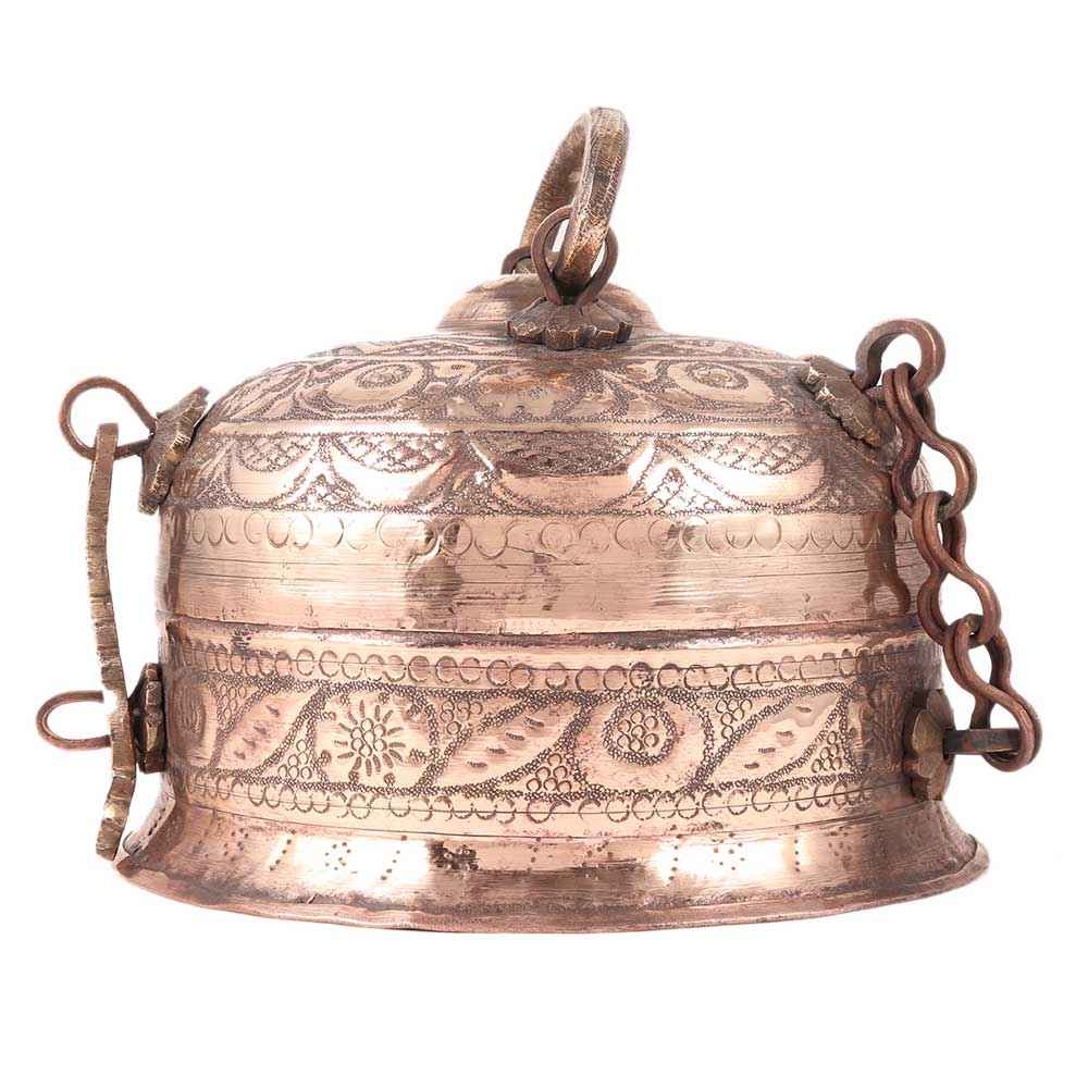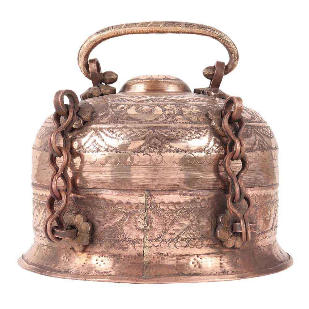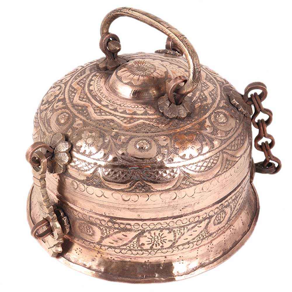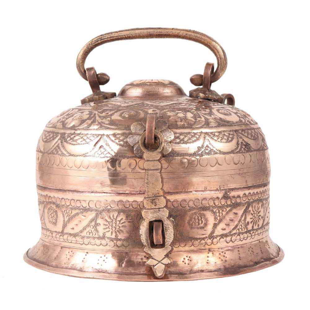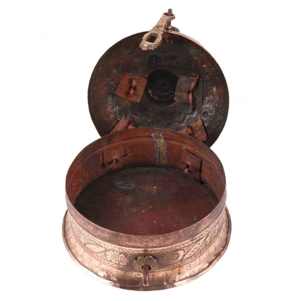 Handmade huge ornamental round brass Anglo Indian box with lid, clasp, and handle that has been gently and artistically hand-hammered with flower, leaves and geometric patterns. It was most likely used as a jewellery box, a decorative for your home or office interiors.   Excellent decorative art piece made of brass.
