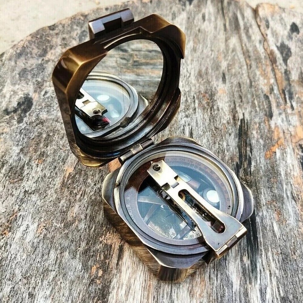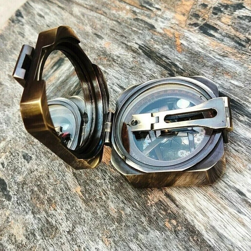 This brass field compass combines practical design with collectible craftsmanship, making it a refined artifact for decor and display.