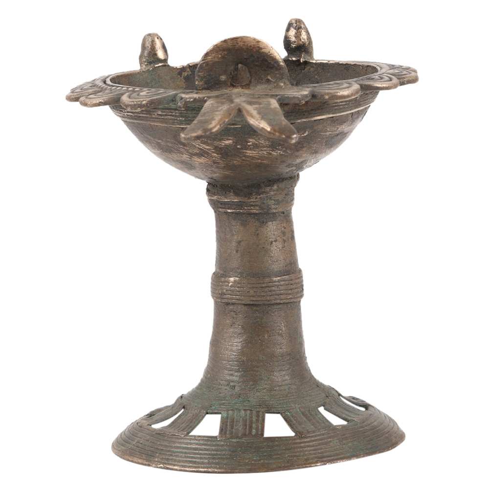 This lovely handmade brass diya has a distinctive fish shaped pattern with a stand can be used to enrich the atmosphere for celebrations such as Deepavali, Durga puja, and Karthikai Deepam. It comes with a dark finish.