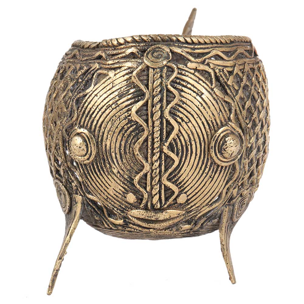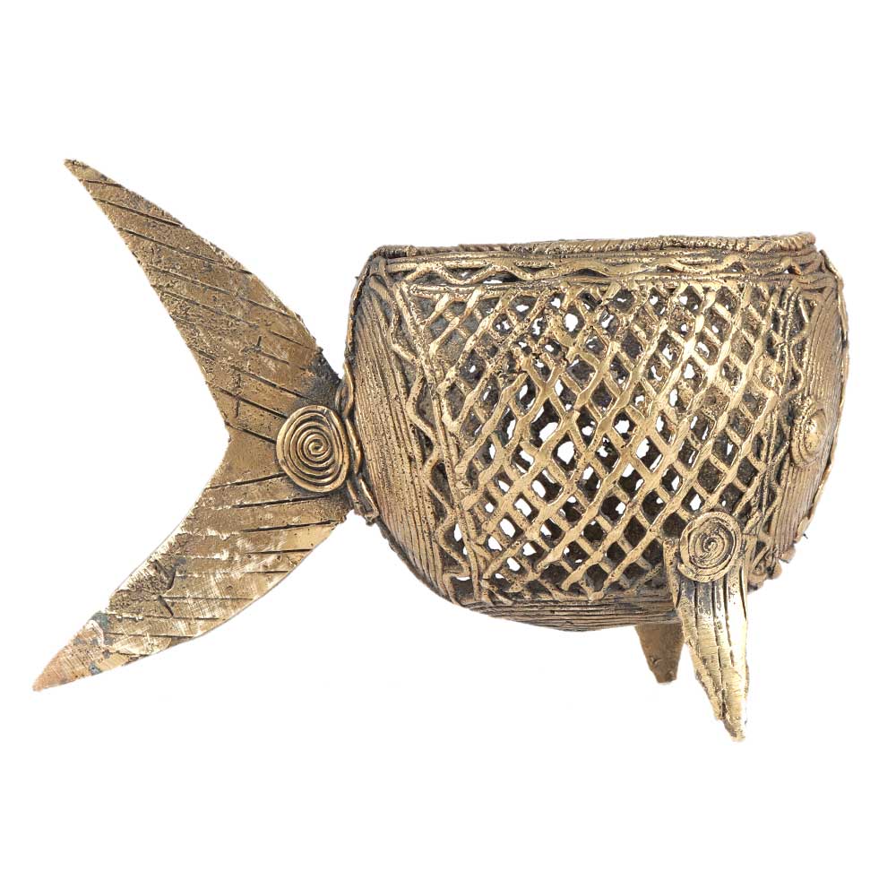 This Brass Pen Holder 'Golden Fish' in jali form the tribal Dokra collection is a stationery item that includes a pen-stand in the style of a fish that is fashioned in brass and has three legs for support. This Dokra art gorgeous fish shaped pen stand is a must-have piece of craftsmanship to add regional warmth to your table design, an attractive display, and an excellent gift for your family members.