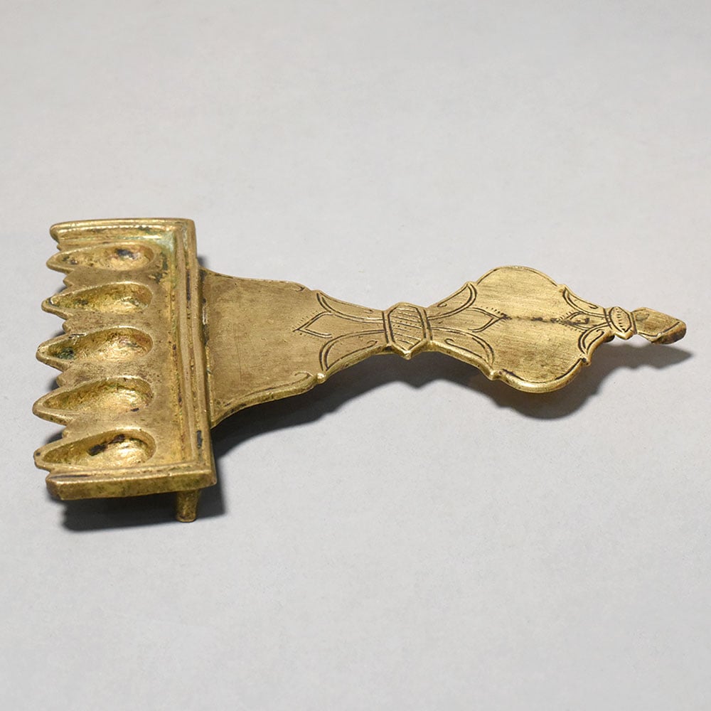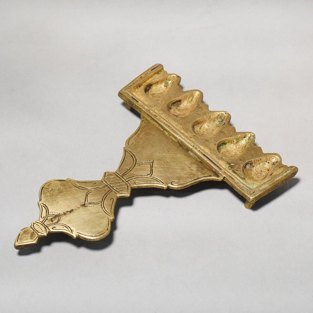 This brass five wick aarti lamp with handle is a traditional ritual lighting instrument used in Hindu worship and temple ceremonies. The lamp features five small oil cavities arranged in a row, designed to hold cotton wicks soaked in oil or ghee. When lit, the five flames create a bright and symbolic offering of light during aarti rituals. The elongated handle is decorated with simple engraved patterns and provides a firm grip while performing aarti. During the ritual, the lamp is gently rotated in circular motions before the deity, representing devotion, gratitude, and the offering of divine light. The five-wick design, also known as Panchmukhi, holds spiritual significance in Hindu tradition. It is often associated with the five sacred elements of nature and symbolizes balance, harmony, and spiritual illumination. Such lamps are commonly used in temples and household prayer rooms during daily pooja and special religious occasions. Made from solid brass, the lamp has a warm golden finish and a sturdy structure suitable for repeated ritual use. The small supporting legs beneath the wick holder help keep the lamp stable when placed on a surface. Ideal for home temples, pooja rituals, festive ceremonies, and spiritual practices, this brass aarti lamp reflects the timeless traditions of devotional worship.