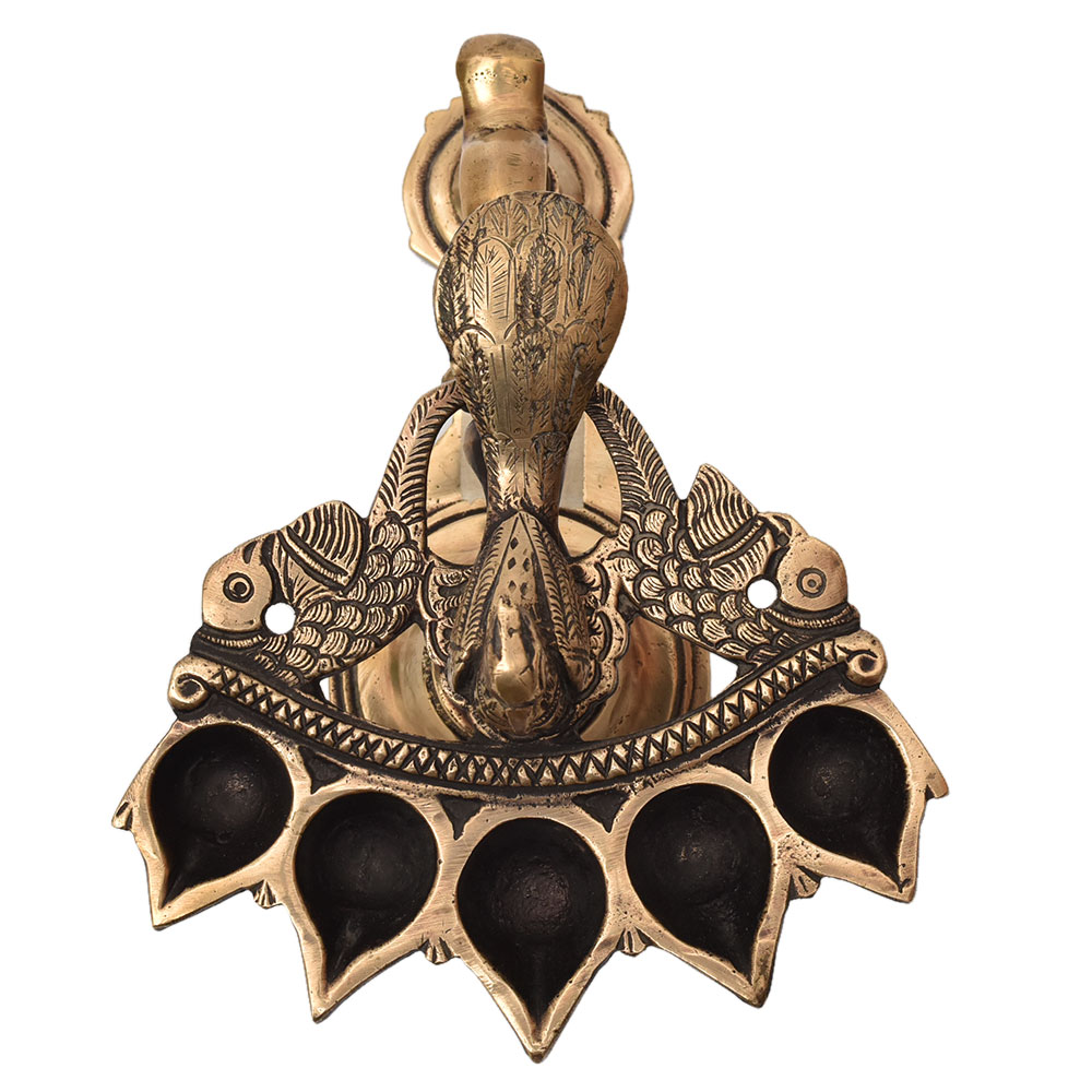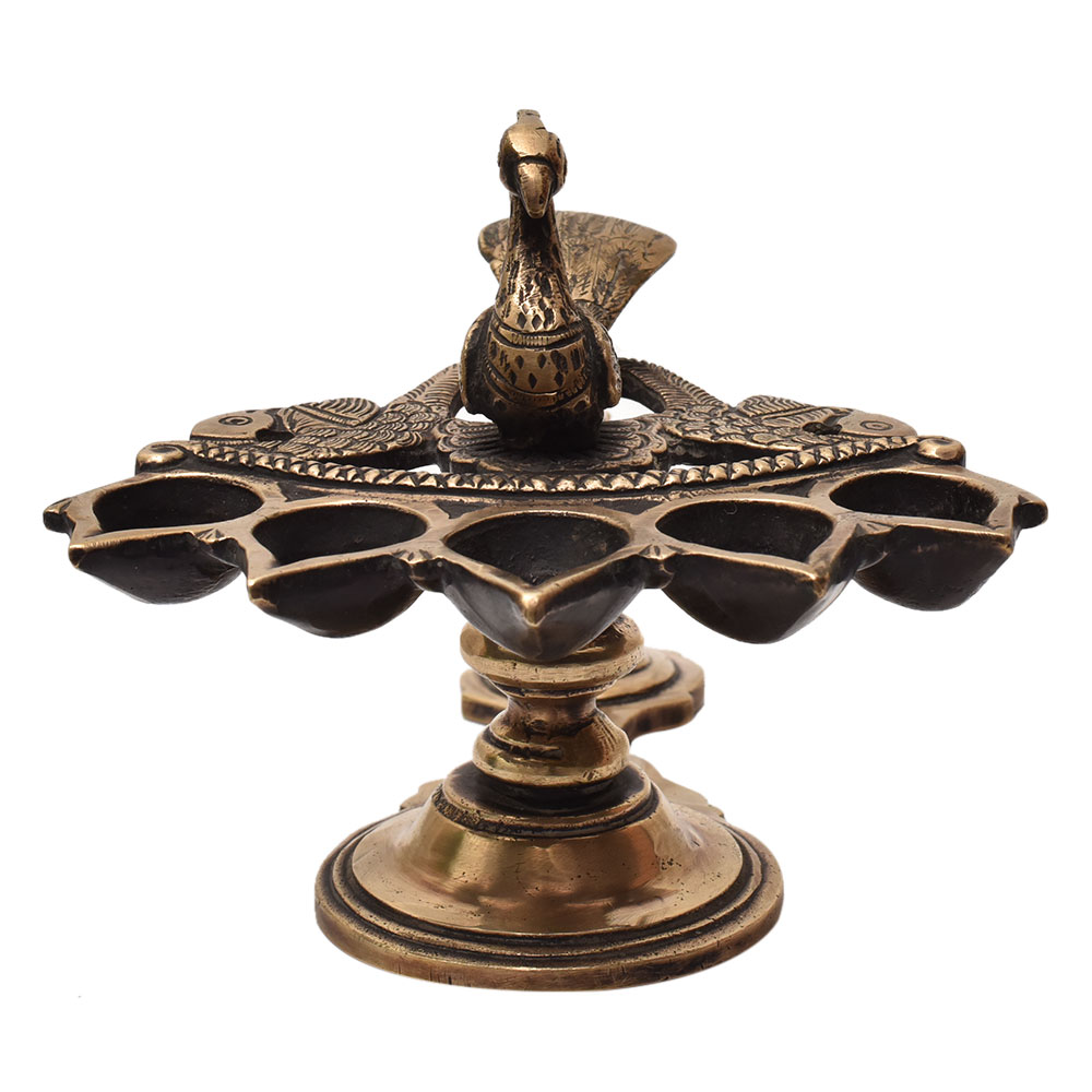 An exquisitely detailed diya stand created through the casting technique. This solid brass diya stand holds 5 diya and features a detailed handle and a peacock perched on top. A wonderful gift for new beginnings.