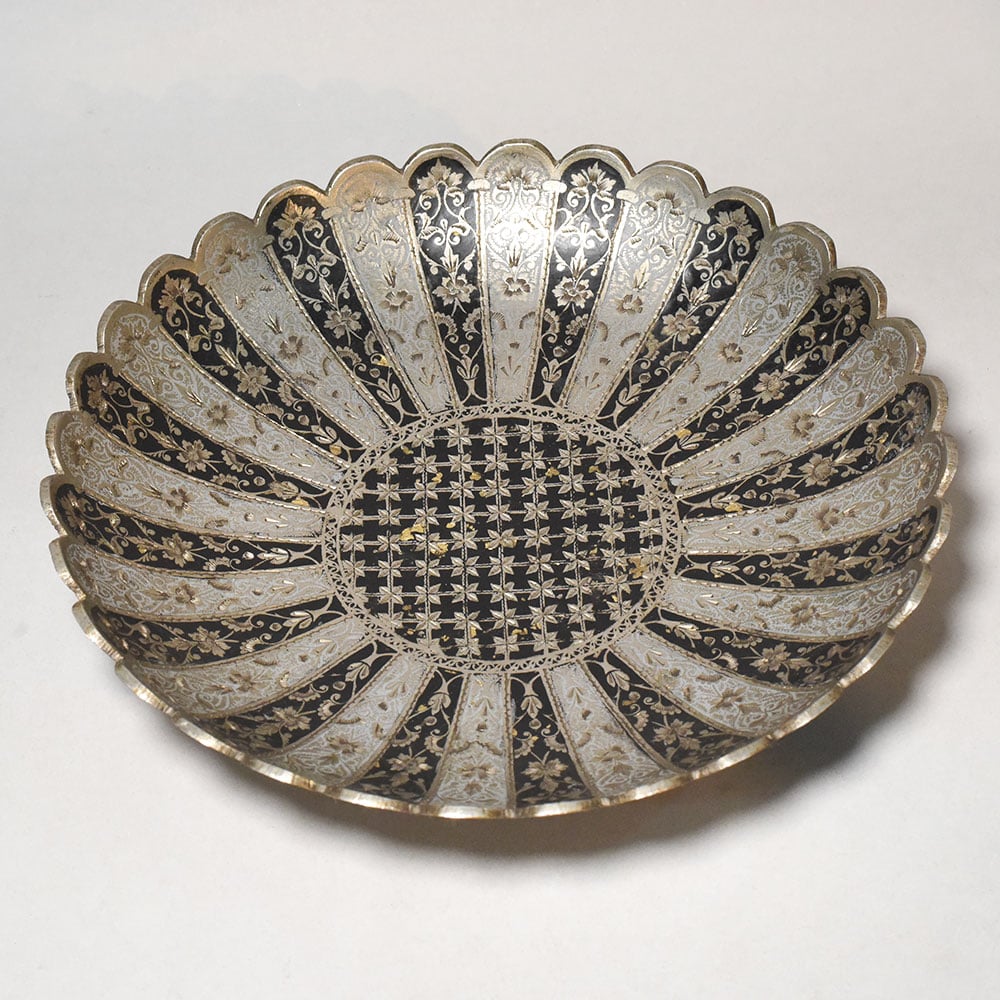 This engraved brass decorative bowl plate features intricate floral patterns and ornamental detailing inspired by traditional Indian metal craftsmanship. The piece has a shallow bowl shape with a scalloped rim and a beautifully balanced design that combines floral engravings with contrasting decorative sections. The interior surface is divided into radiating panels, each filled with delicate floral vines and ornamental motifs. These alternating sections create a striking visual rhythm that highlights the symmetry of the design. At the center, a circular patterned area with repeating star-like engravings adds further decorative depth to the piece. The plate features a two-tone finish where engraved silver-toned patterns stand out against darker background sections, creating a rich contrast that enhances the intricate craftsmanship. The scalloped edges further emphasize the decorative nature of the bowl while giving it a refined, elegant appearance. Crafted from brass, the piece displays natural patina and subtle tonal variations that contribute to its antique-style aesthetic. Such decorative bowls are often used for serving dry snacks, displaying fruits, presenting offerings during rituals, or as ornamental tabletop decor. Ideal for traditional home decor, festive table settings, spiritual offerings, or collectible displays, this engraved brass bowl plate reflects classic decorative artistry and heritage-inspired design.
