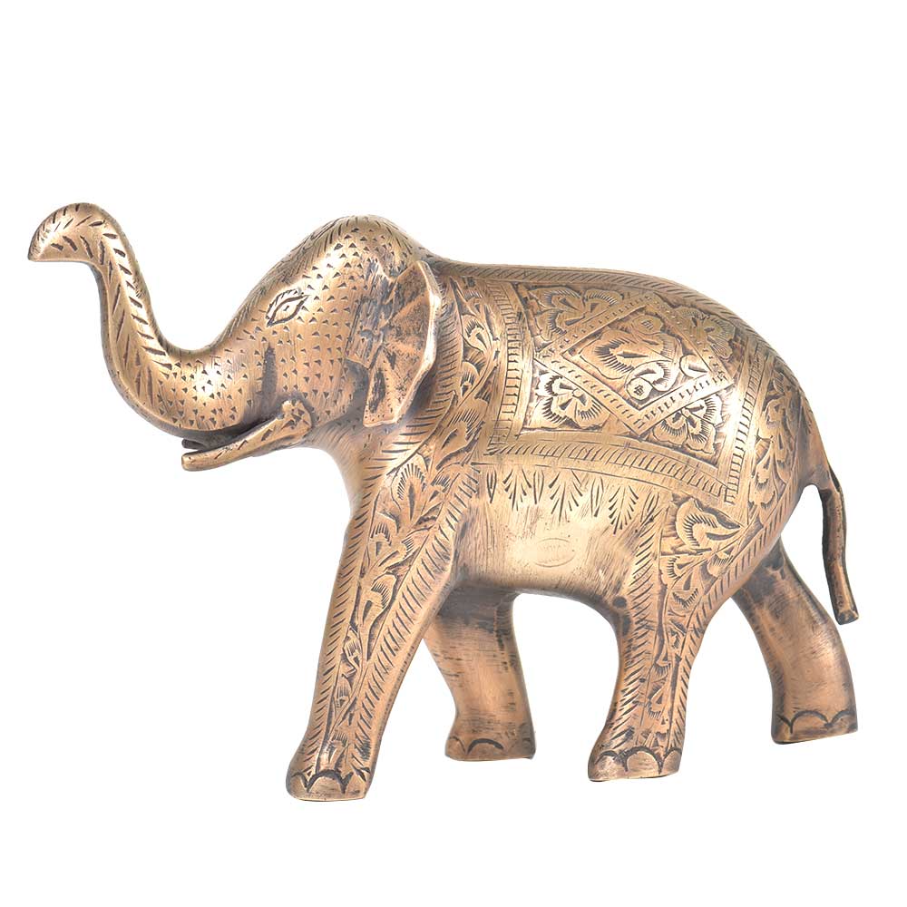 • Brass Floral Engraved Elephant Raised Trunk Statue
