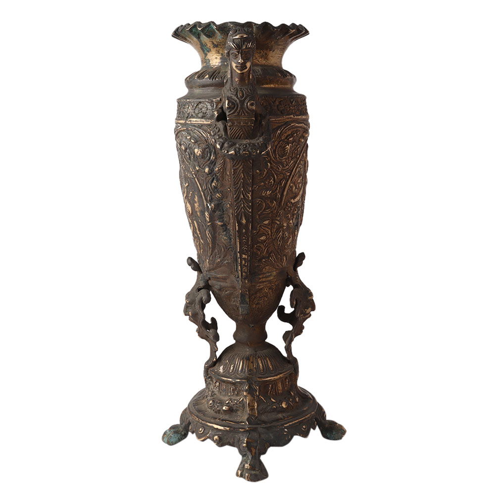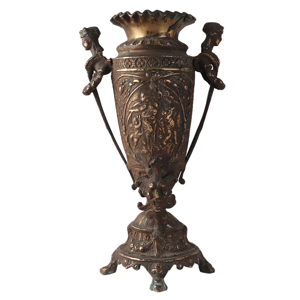 This vintage style flower pot is an exquisite decorative piece for your home, office or restaurant and will match any decor. It is beautifully carved from brass in European art. Full of engravings, this incredible piece will be an eye-catcher for your guests and visitors. It has integrated handles with a statue of a man on both handles. Engraved with sophisticated motifs and dancing women. This magnificent flower pot in European art is an ideal gift for special and festive occasions for your loved ones.