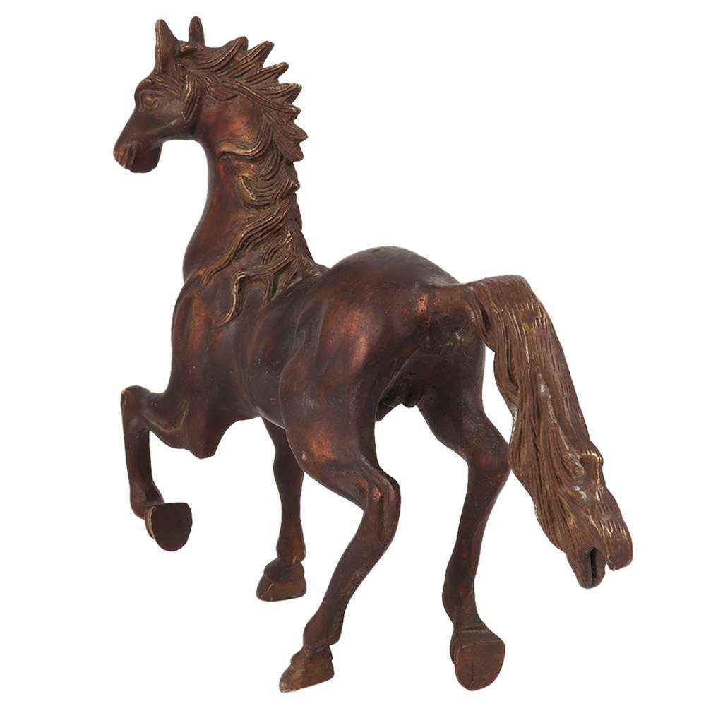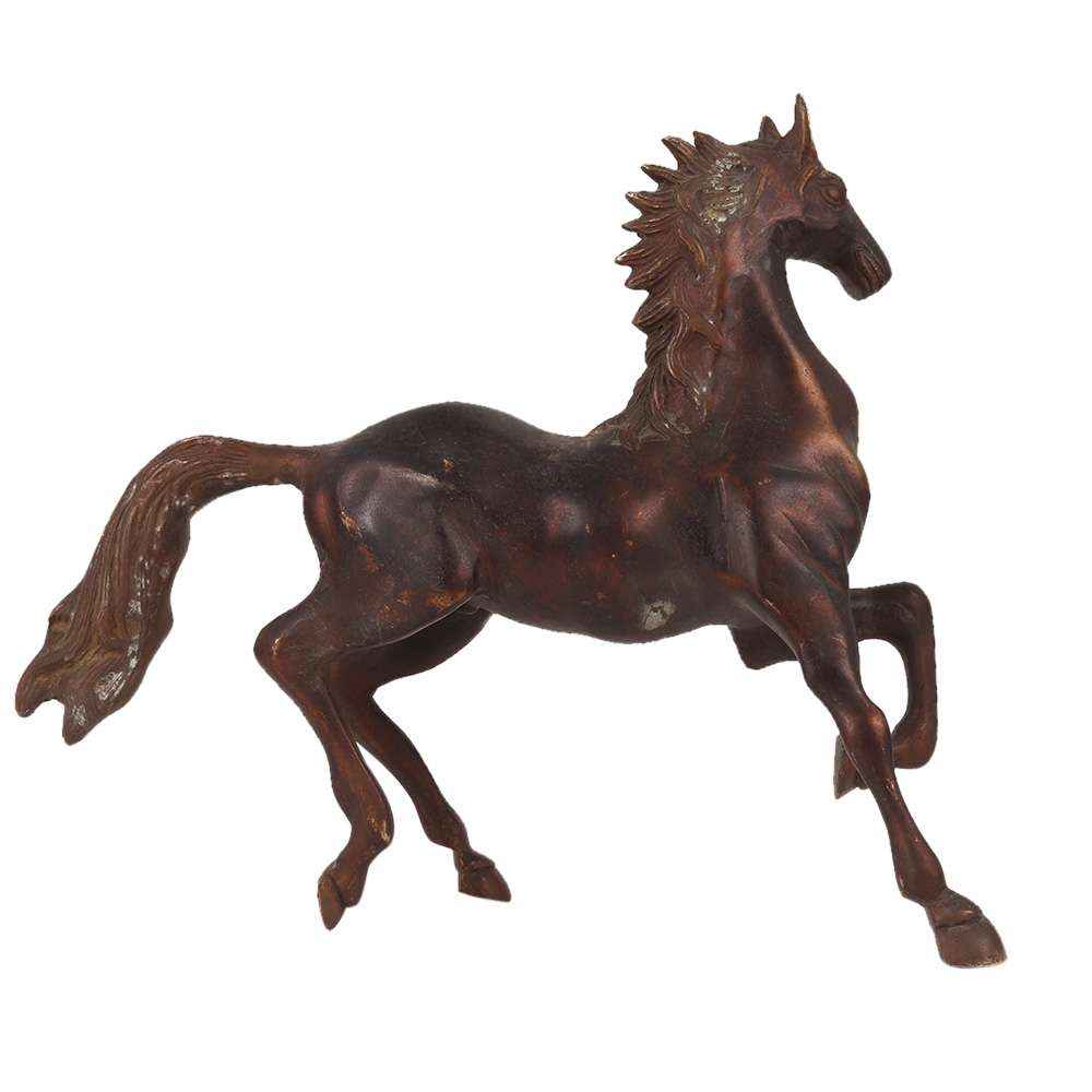A galloping vintage brass horse figurine. As he sprints, his tail and mane fly. This majestic and playful horse would look excellent in a library, an animal themed nursery, as a workplace paperweight, or as a sculptural statement piece on a shelf in a modern furniture inspired space. This horse is not hollow, but rather sturdy.