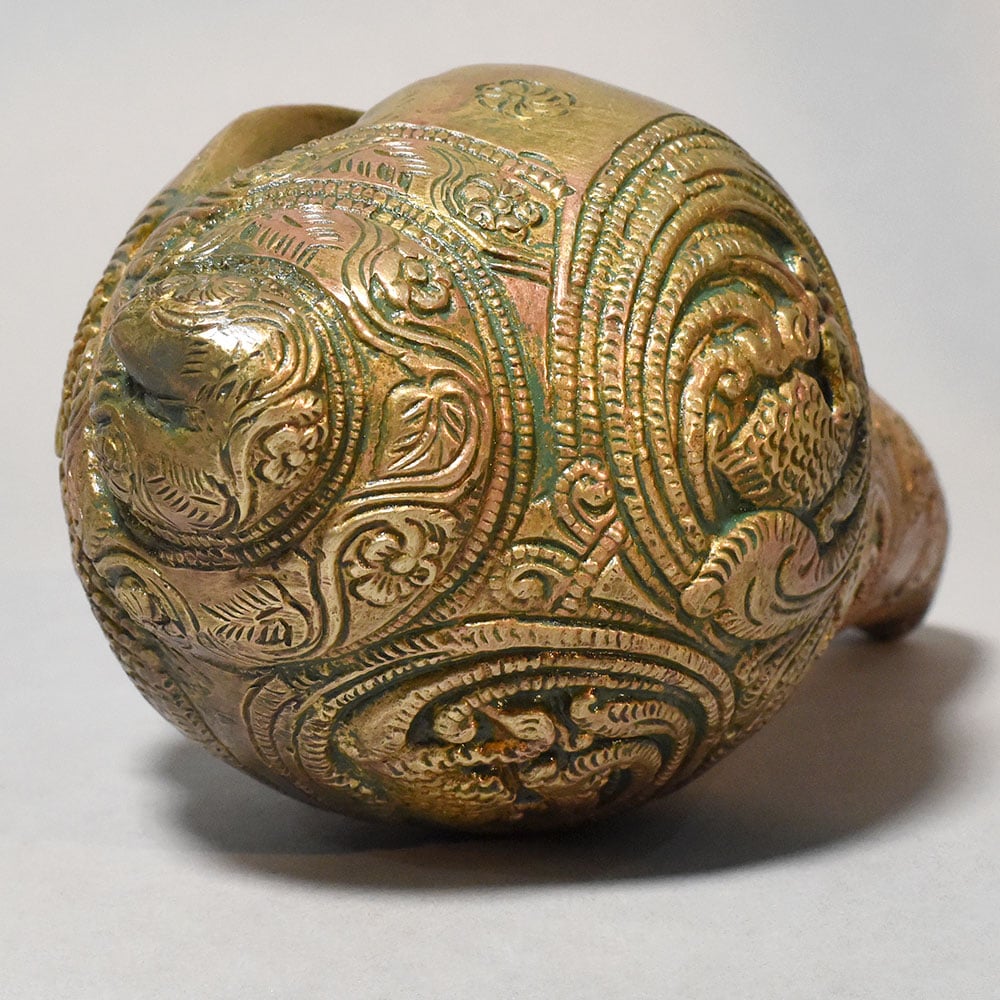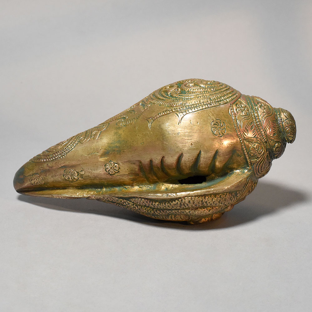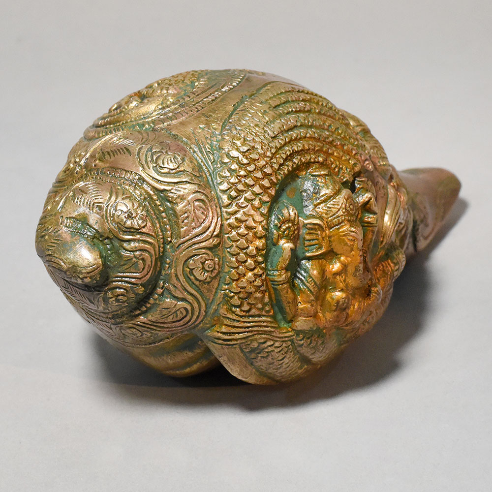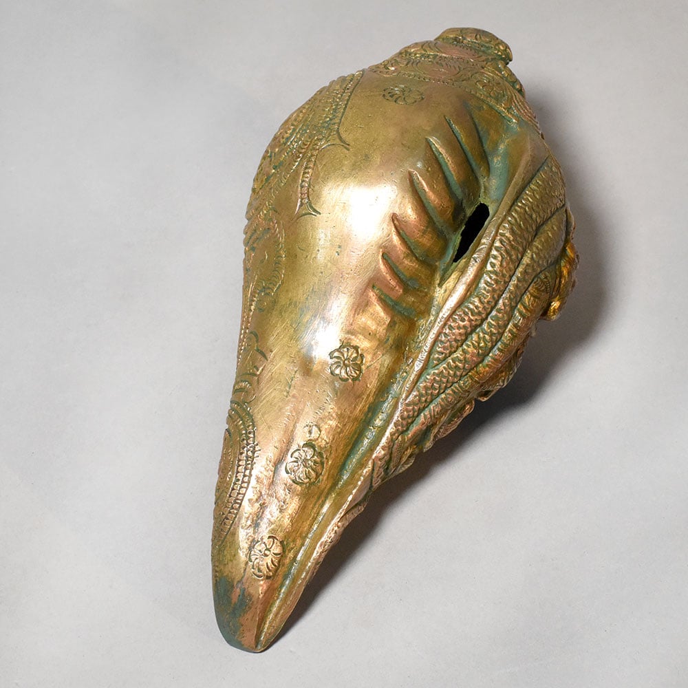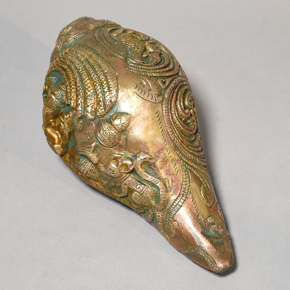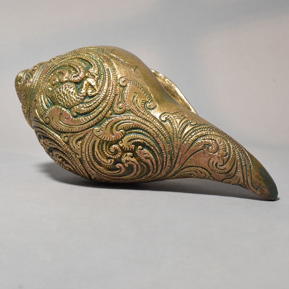 This brass Ganesh carved shankh conch decorative idol is a finely detailed spiritual artifact inspired by traditional Hindu symbolism. The sculpture takes the form of a sacred conch shell and features intricate relief carvings of Lord Ganesha along with mythological motifs and sacred animals, creating a piece that blends devotional meaning with traditional metal craftsmanship. In Hindu culture, the Shankh (conch shell) represents purity, sacred sound, and divine energy. It is closely associated with temple rituals, spiritual awakening, and auspicious beginnings. The presence of Lord Ganesha, the remover of obstacles and the deity of wisdom and prosperity, makes this sculpture especially meaningful for spiritual spaces and sacred decor. The detailed carving of Lord Ganesha seated within the shell reflects traditional Indian artistic styles often seen in temple sculptures and ritual objects. Surrounding motifs, including symbolic animals and decorative patterns, enhance the mythological narrative and give the piece a rich visual depth. Made from solid brass, the sculpture has a warm golden tone with natural patina and subtle oxidized highlights that enhance the carved details and give the piece a vintage appearance. Ideal for home temples, spiritual decor, meditation spaces, or collectible religious art, this brass Ganesh shankh sculpture is both a meaningful devotional object and a distinctive decorative artifact.
